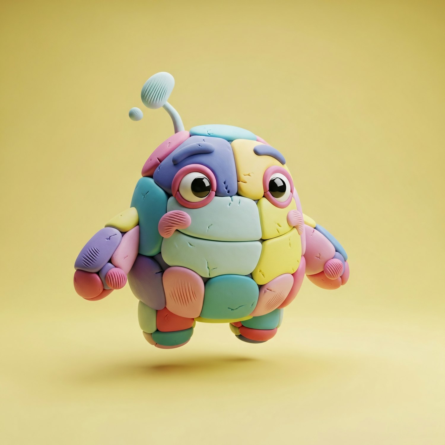A vibrant clay-like robot character with pastel colors and a cheerful expression, set against a plain yellow background.