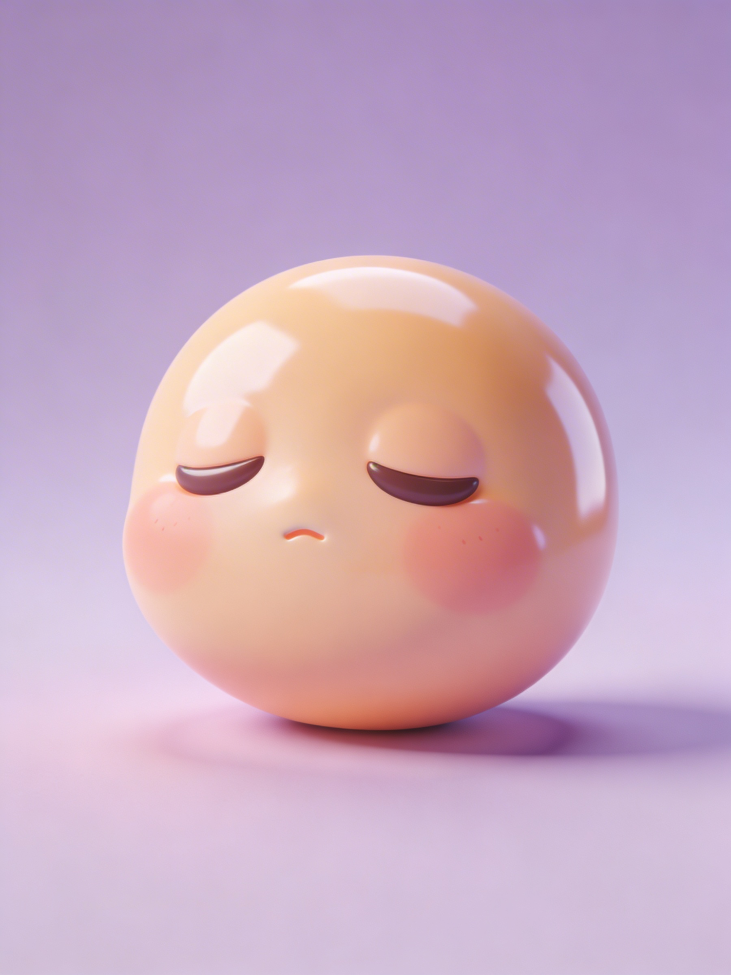 A cute 3D-rendered spherical character with closed eyes and blushed cheeks, set against a soft purple gradient background.