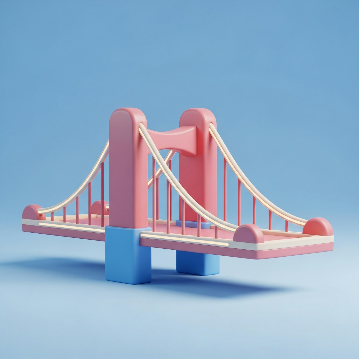 A pastel pink and blue stylized suspension bridge with smooth lines and a minimalistic design against a light blue background.
