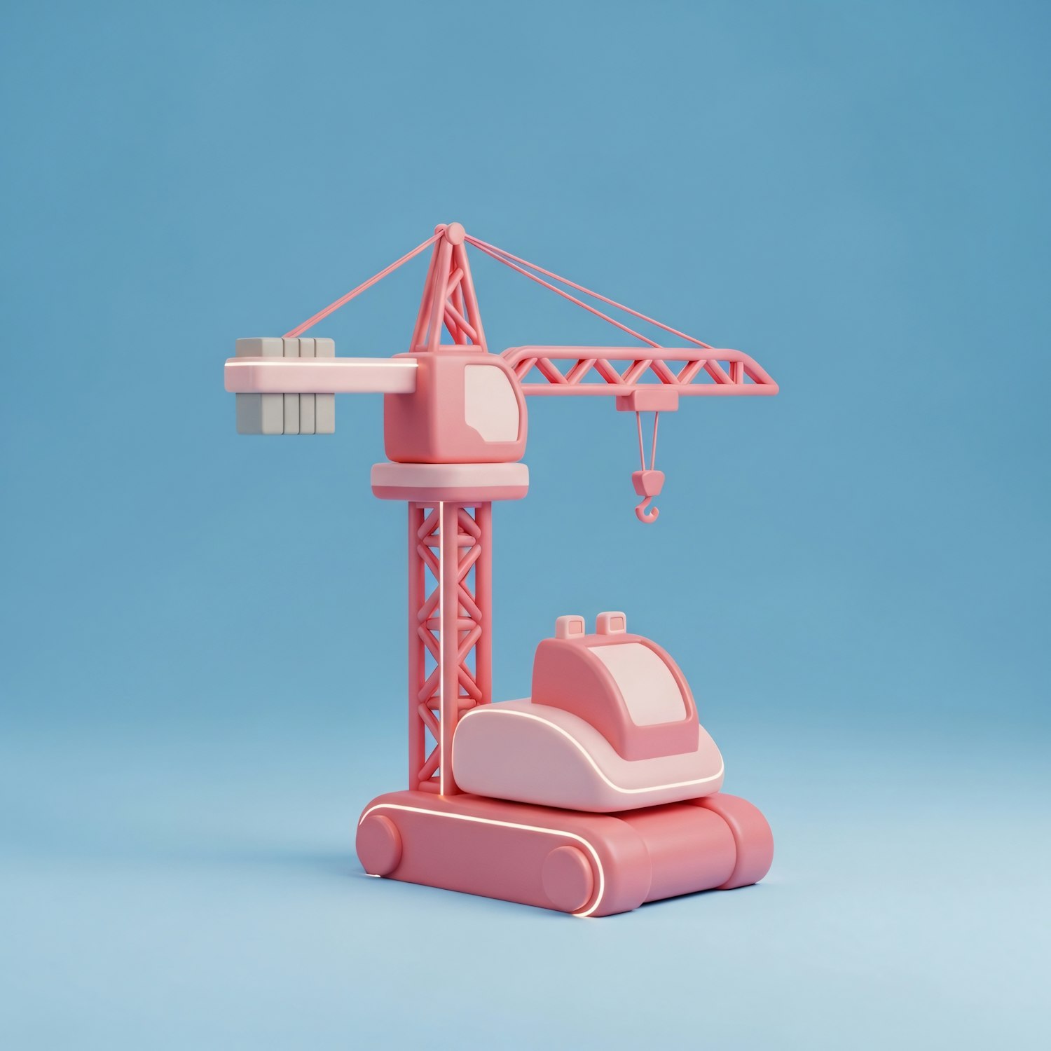 A pastel pink and white toy crane rendered in 3D, set against a light blue background, showcasing a playful and modern design.