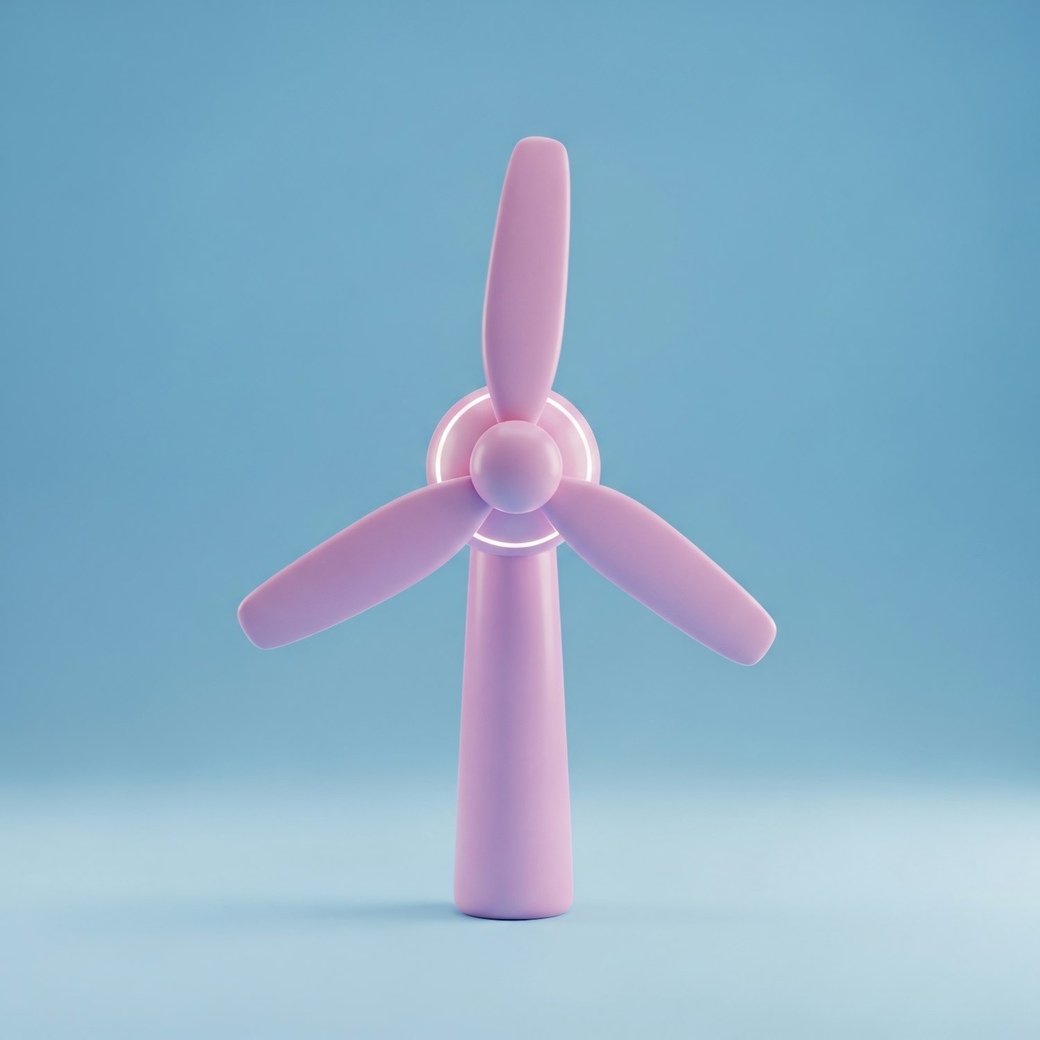 A pastel pink wind turbine in a minimalist 3D design, set against a clean blue gradient background, creating a modern and playful aesthetic.