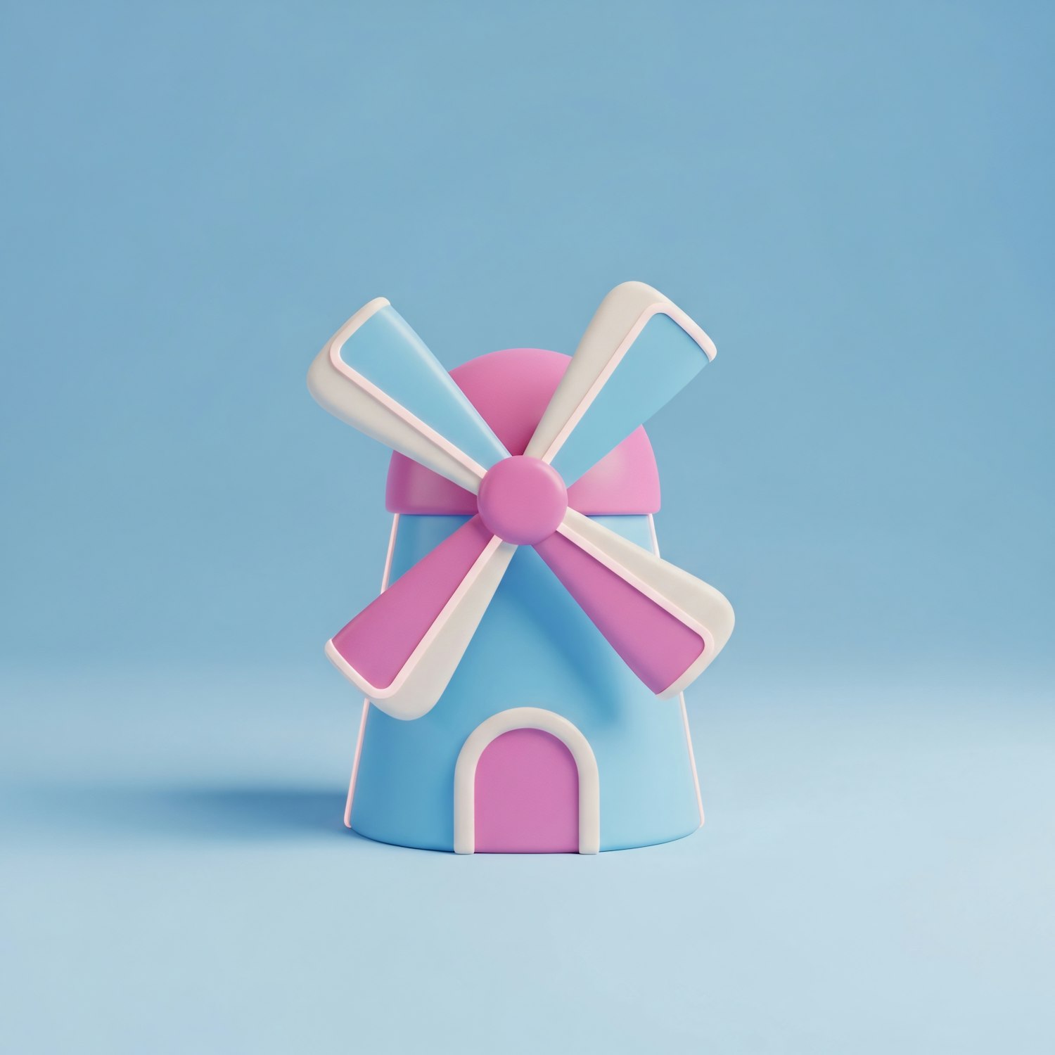 A pastel-colored windmill with pink and blue tones on a light blue background, showcasing a playful and minimalistic design.