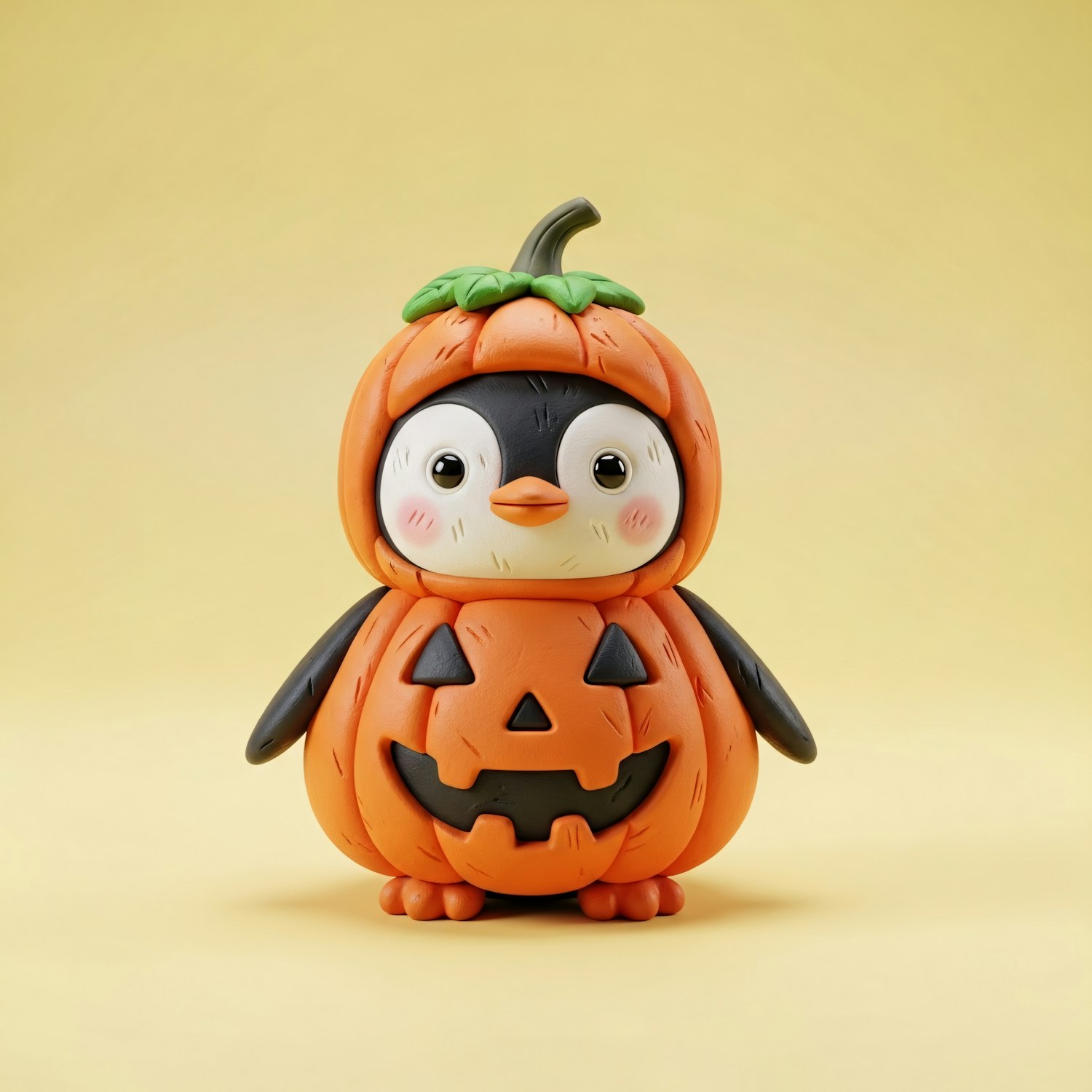 Adorable penguin figurine in a pumpkin costume with a jack-o'-lantern design, set against a soft yellow background.