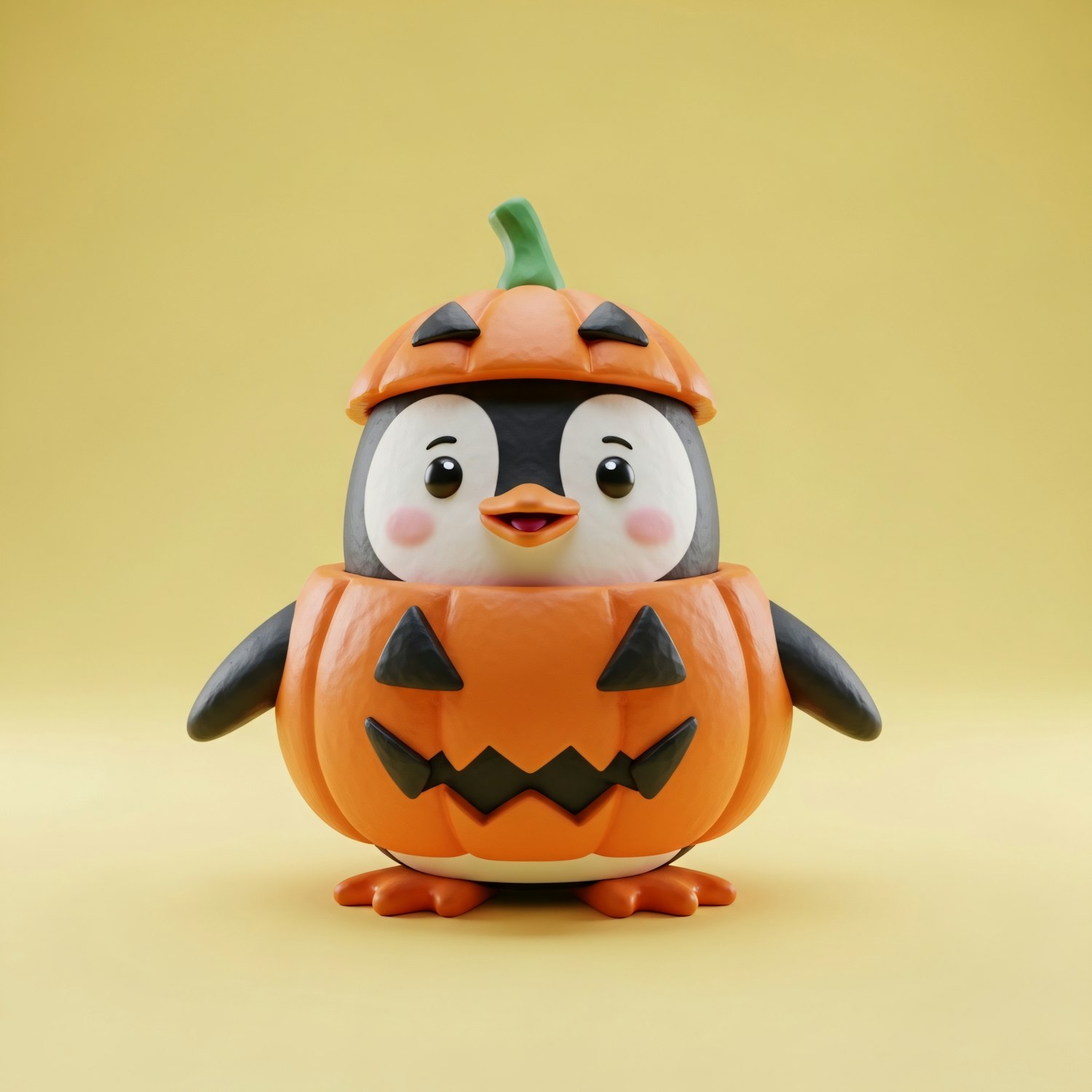 Adorable penguin figurine in a pumpkin costume with a cheerful expression, perfect for Halloween decor, set against a yellow background.