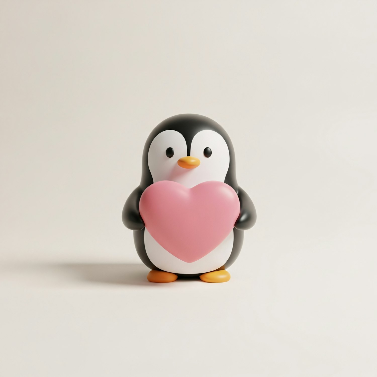 Adorable penguin figurine holding a pink heart, set against a plain background, perfect for conveying love and warmth.