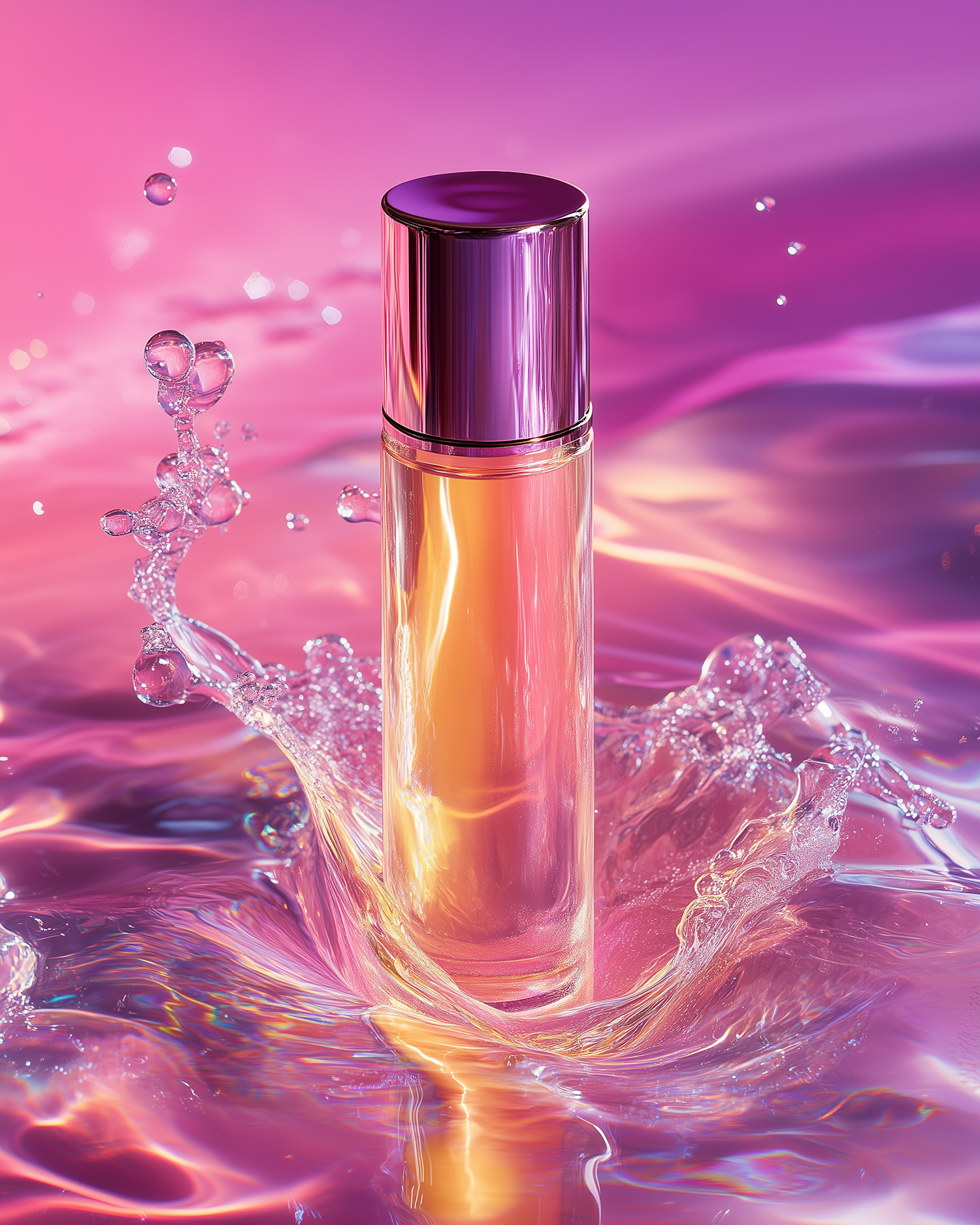 Elegant perfume bottle with metallic cap in vibrant pink and purple splash, creating a luxurious and dynamic visual.