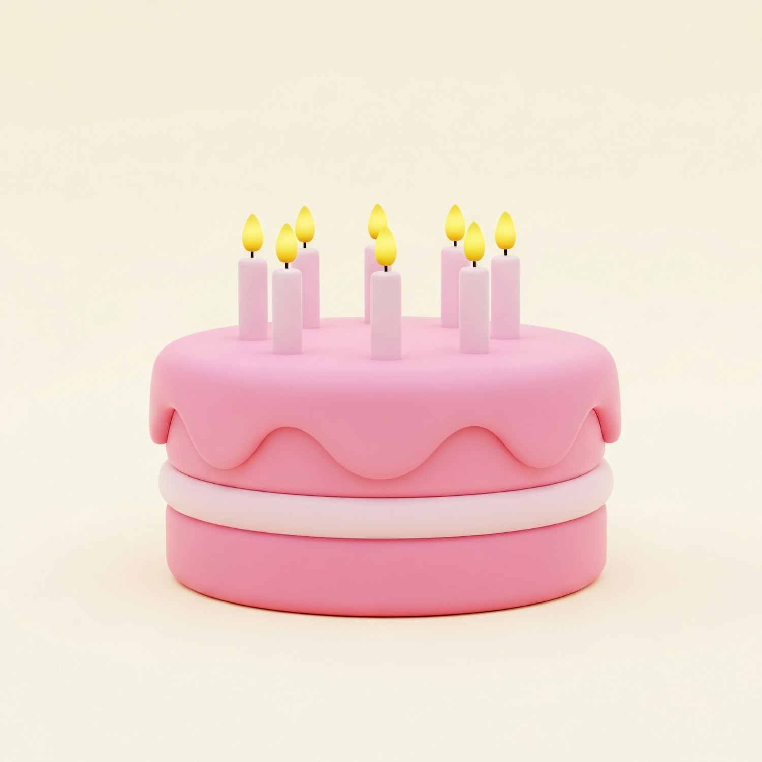 A pastel pink birthday cake with white candles and yellow flames, set against a soft beige background, creating a minimalistic aesthetic.