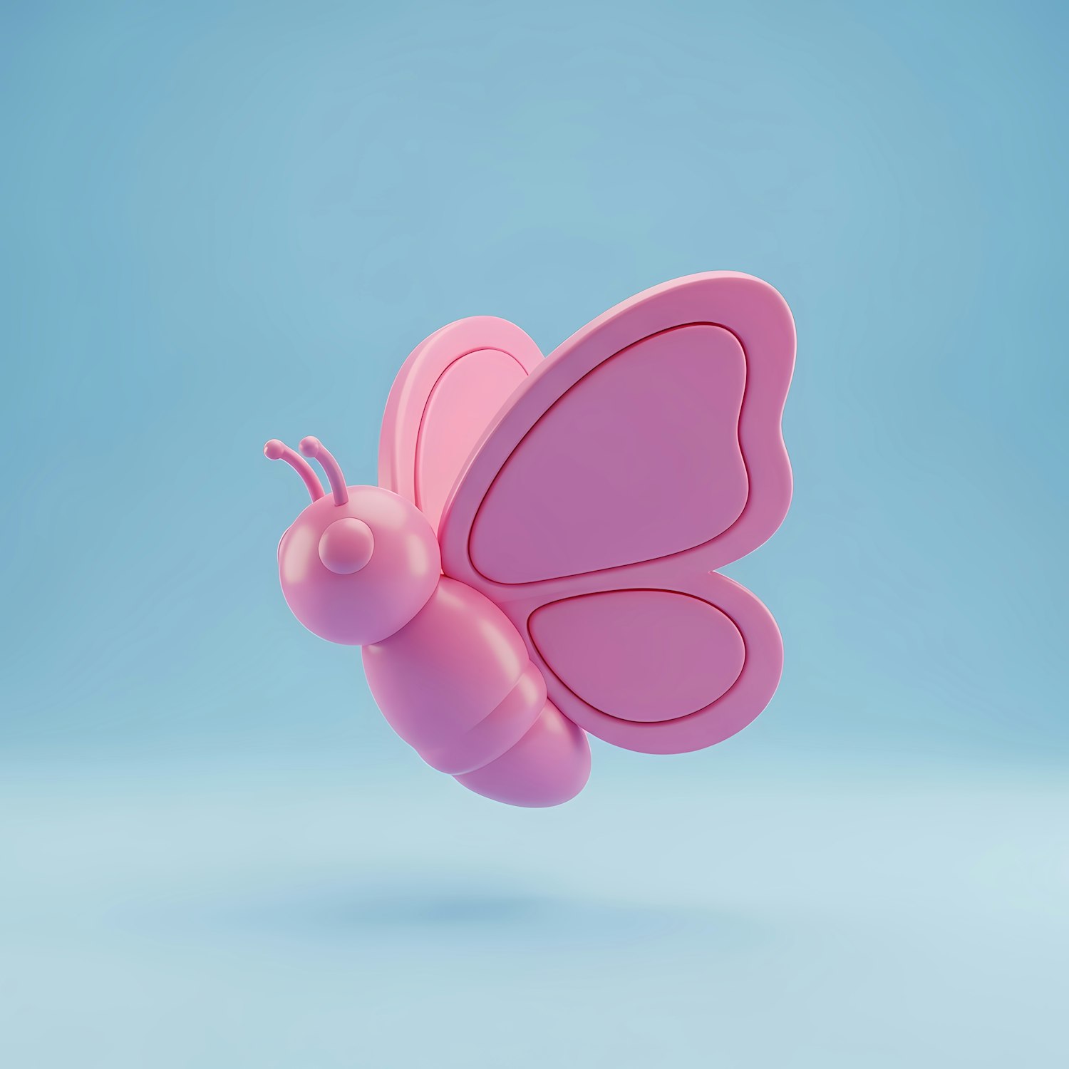 A vibrant 3D pink butterfly with heart-shaped wings against a soft blue background, showcasing a playful and minimalistic design.