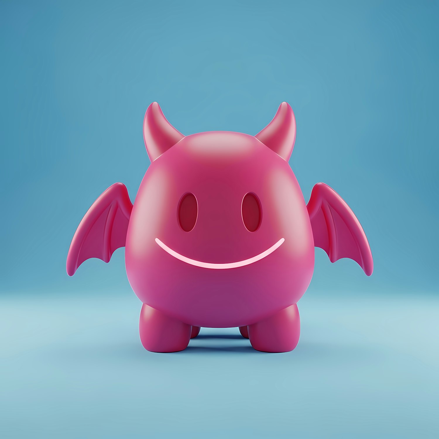 Adorable 3D pink devil character with horns, wings, and a cute smile, set against a clean blue background. Perfect for fun designs!