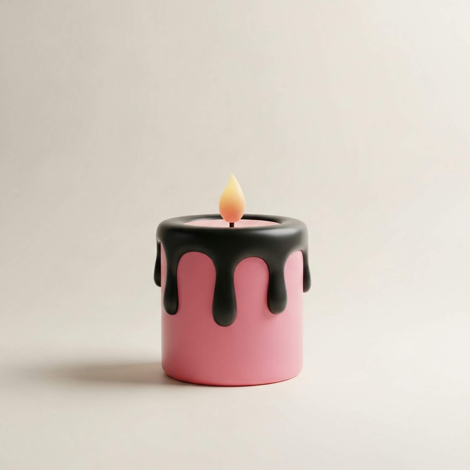 A pink candle with black wax drips and a small flame, set against a neutral background, creating a modern and stylish aesthetic.