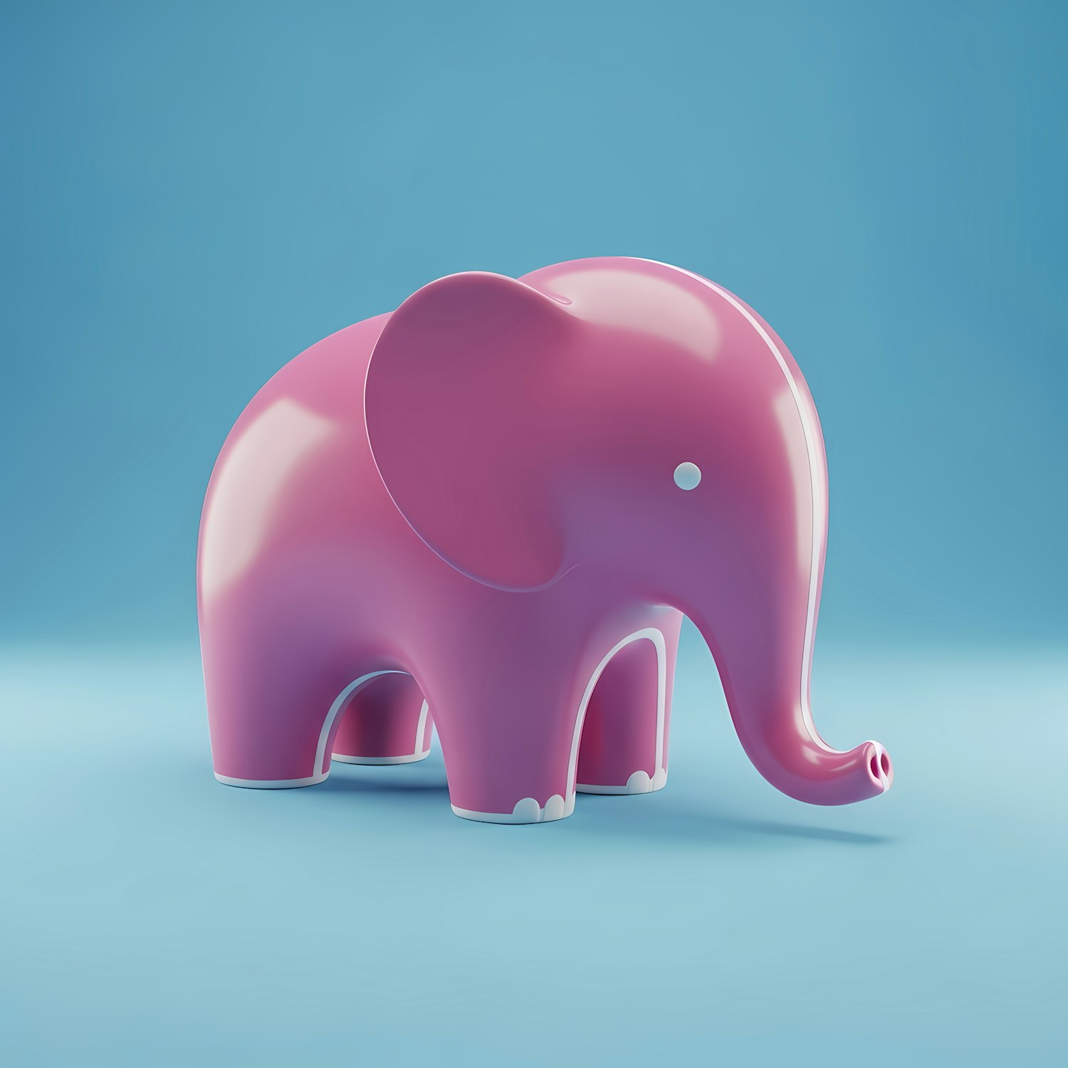 A cute pink 3D elephant with a glossy finish stands against a clean blue background, showcasing a playful and modern design.