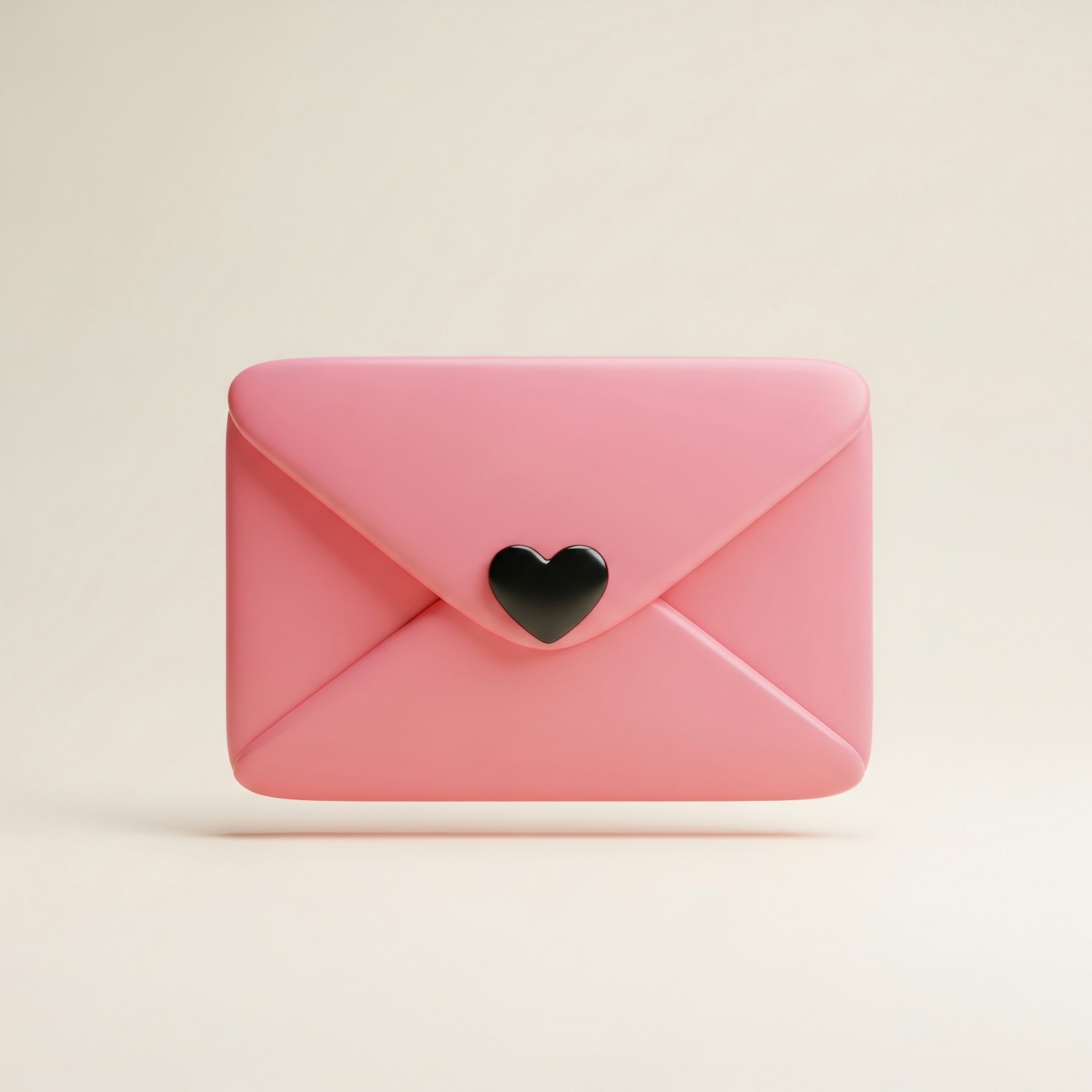 A pink envelope-shaped clutch with a black heart clasp, set against a neutral background, showcasing a modern and minimalistic design.