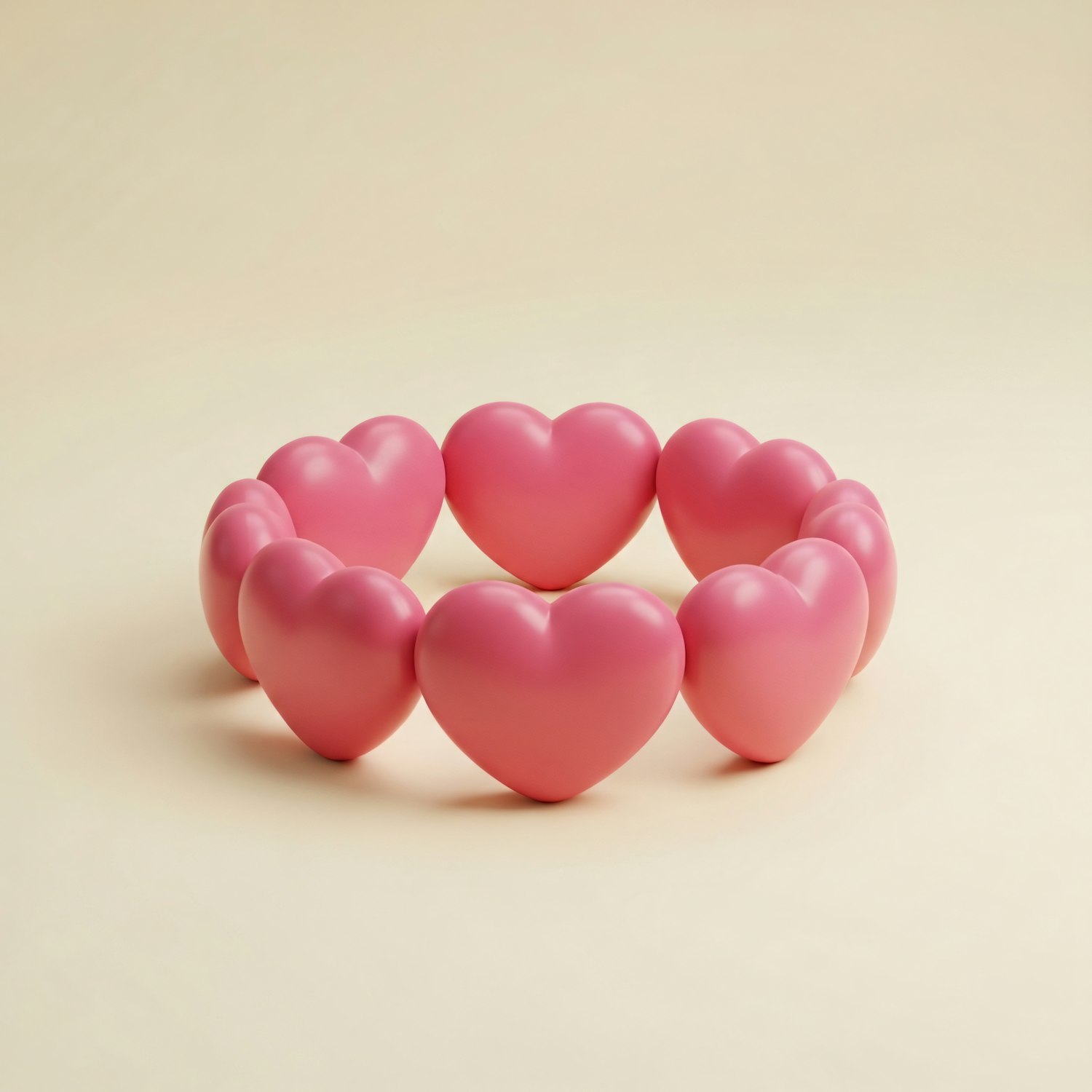 A circular arrangement of glossy pink hearts on a beige background, creating a vibrant and symmetrical composition.