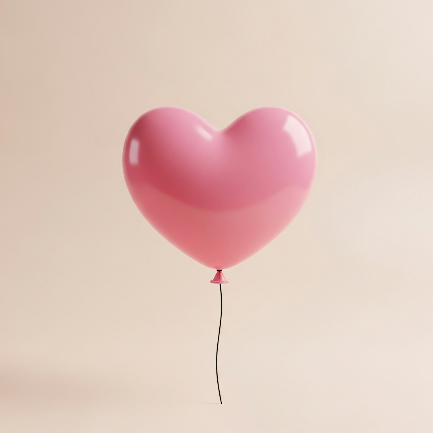 A pink heart-shaped balloon with a glossy finish floats against a soft beige background, creating a simple and charming visual.