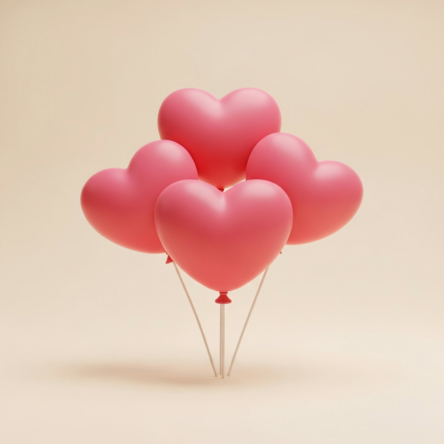 Four pink heart-shaped balloons tied together, floating against a soft beige background, creating a cheerful and romantic vibe.
