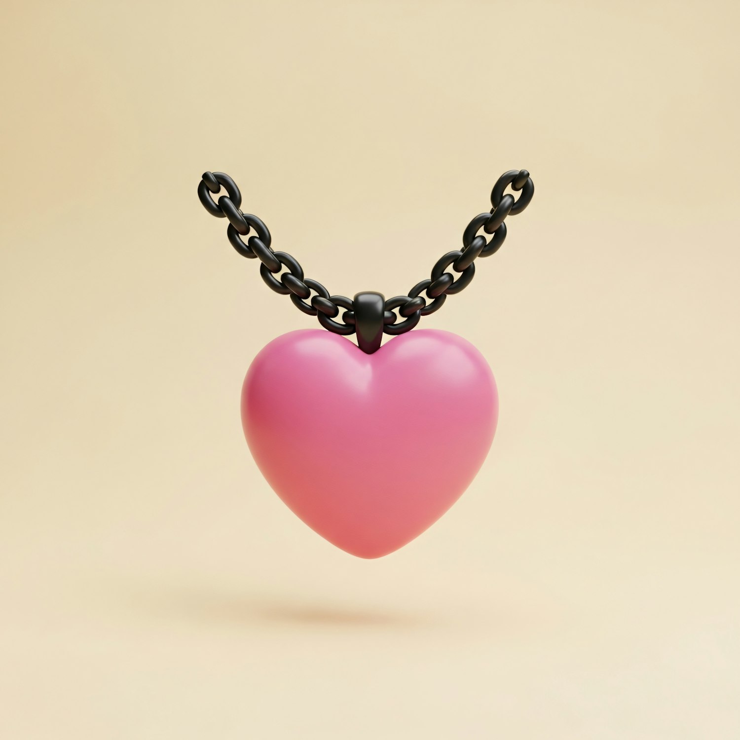 A pink heart-shaped pendant on a black chain, set against a beige background, showcasing a modern and minimalistic design.
