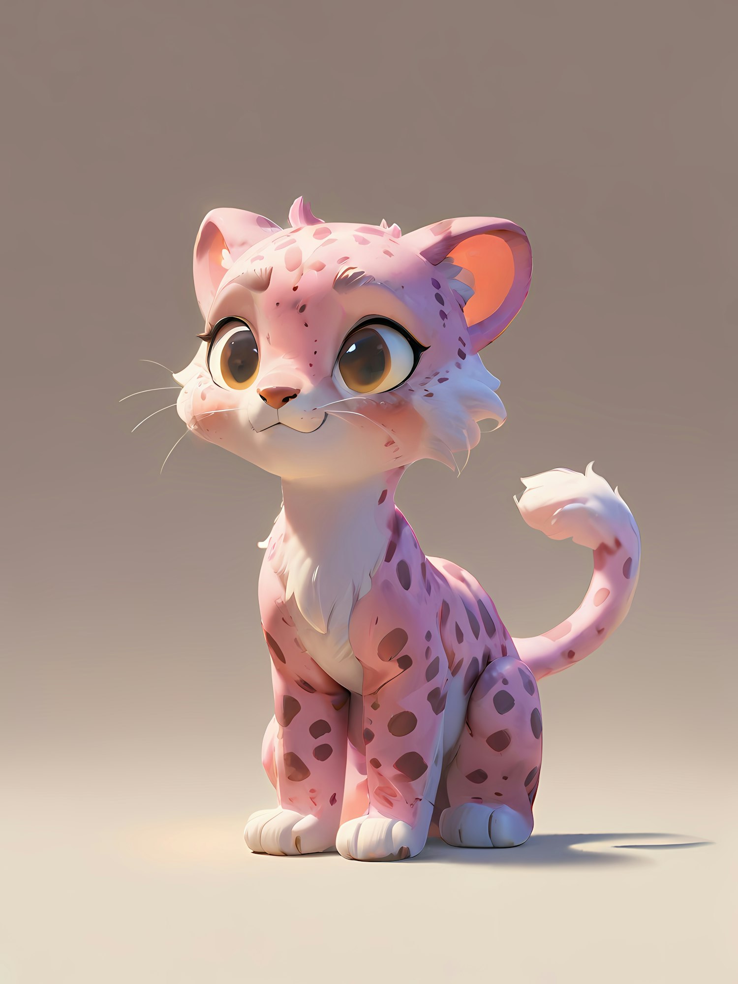 Adorable pink leopard cub with big brown eyes and playful expression in a 3D illustration. Perfect for animal lovers and whimsical art fans.