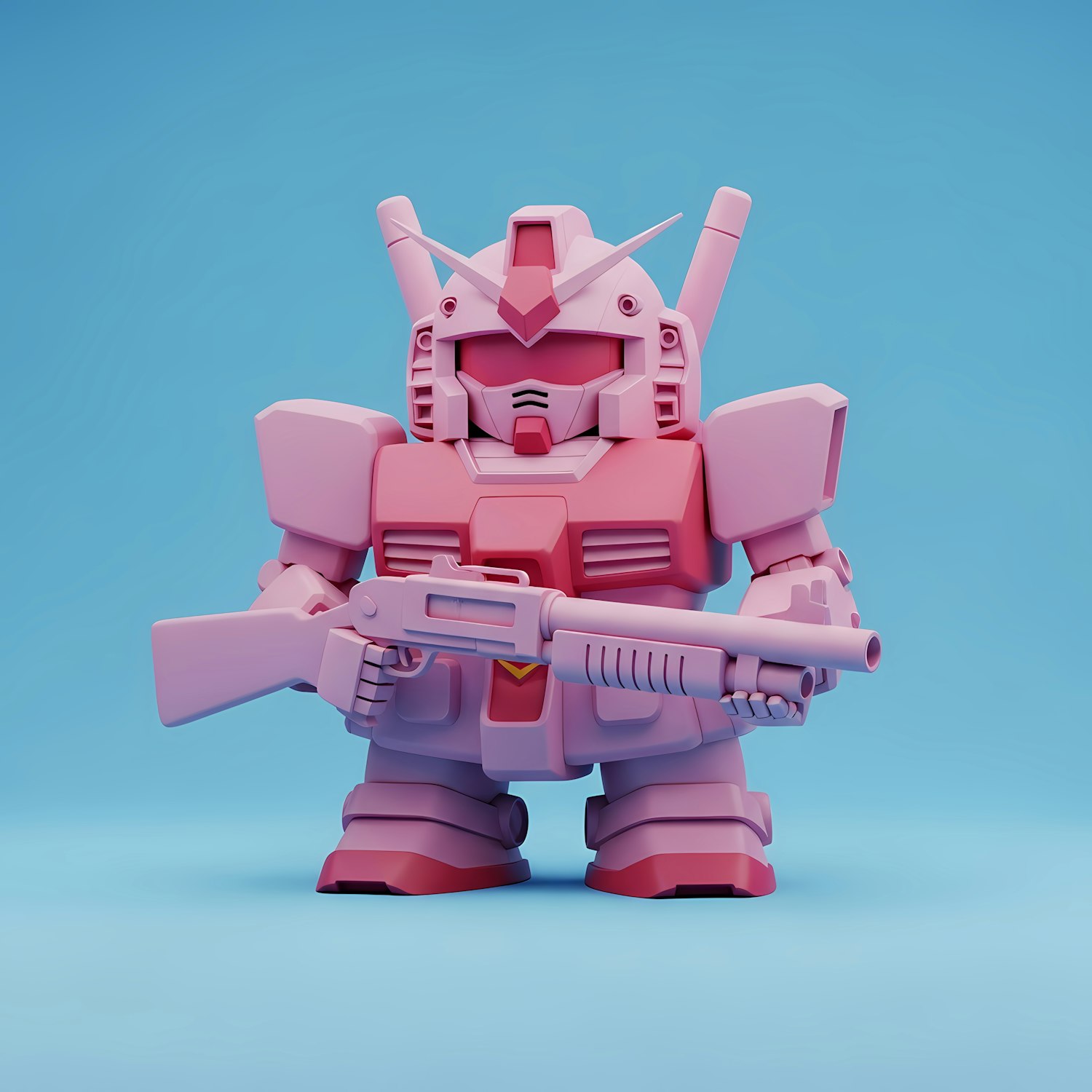 A cute pink mecha robot holding a rifle, set against a vibrant blue background. Perfect for fans of futuristic designs and robots.
