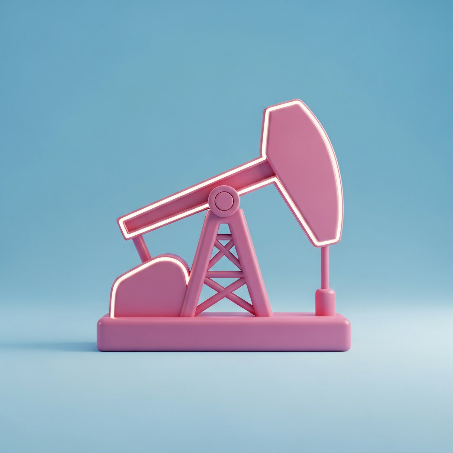 A vibrant pink 3D oil pumpjack against a gradient blue background, blending industrial design with modern artistic aesthetics.