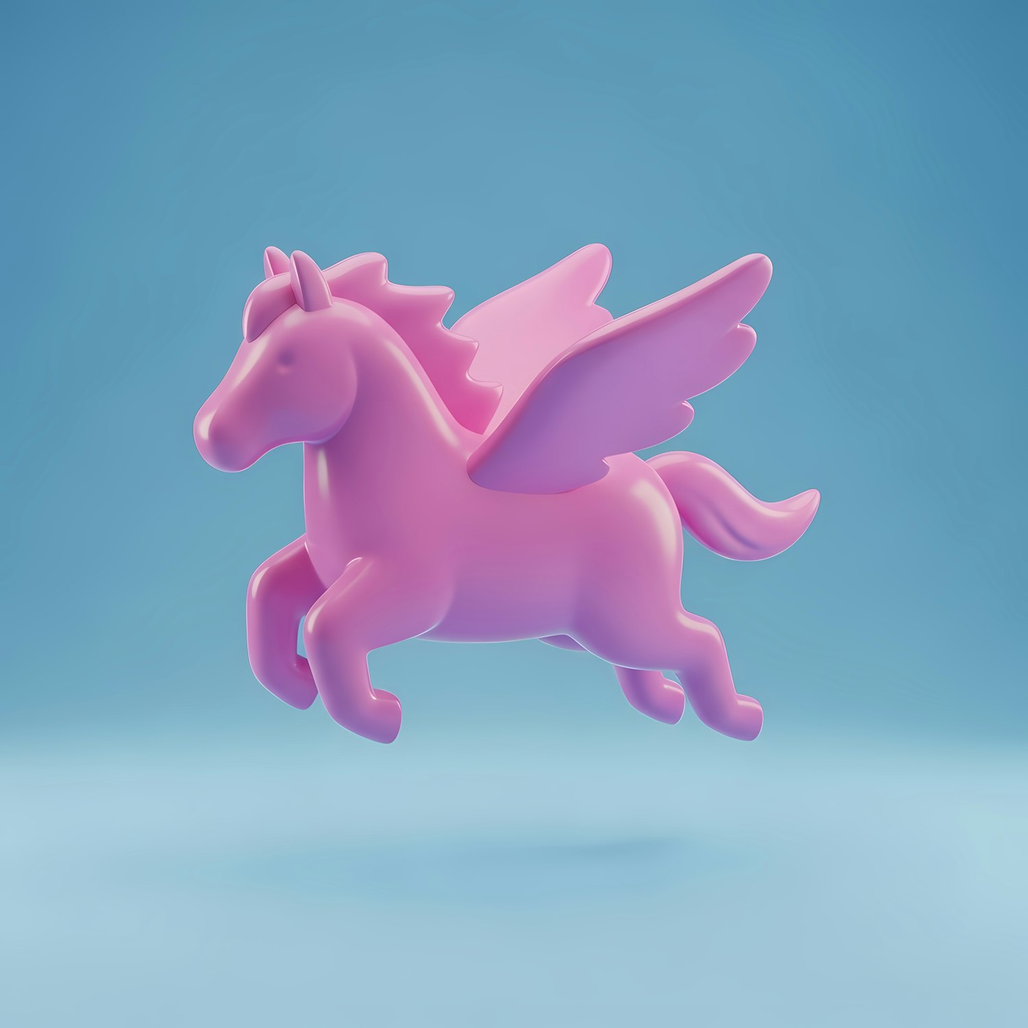 A vibrant 3D pink Pegasus with wings, floating against a soft blue gradient background, perfect for whimsical and fantasy themes.