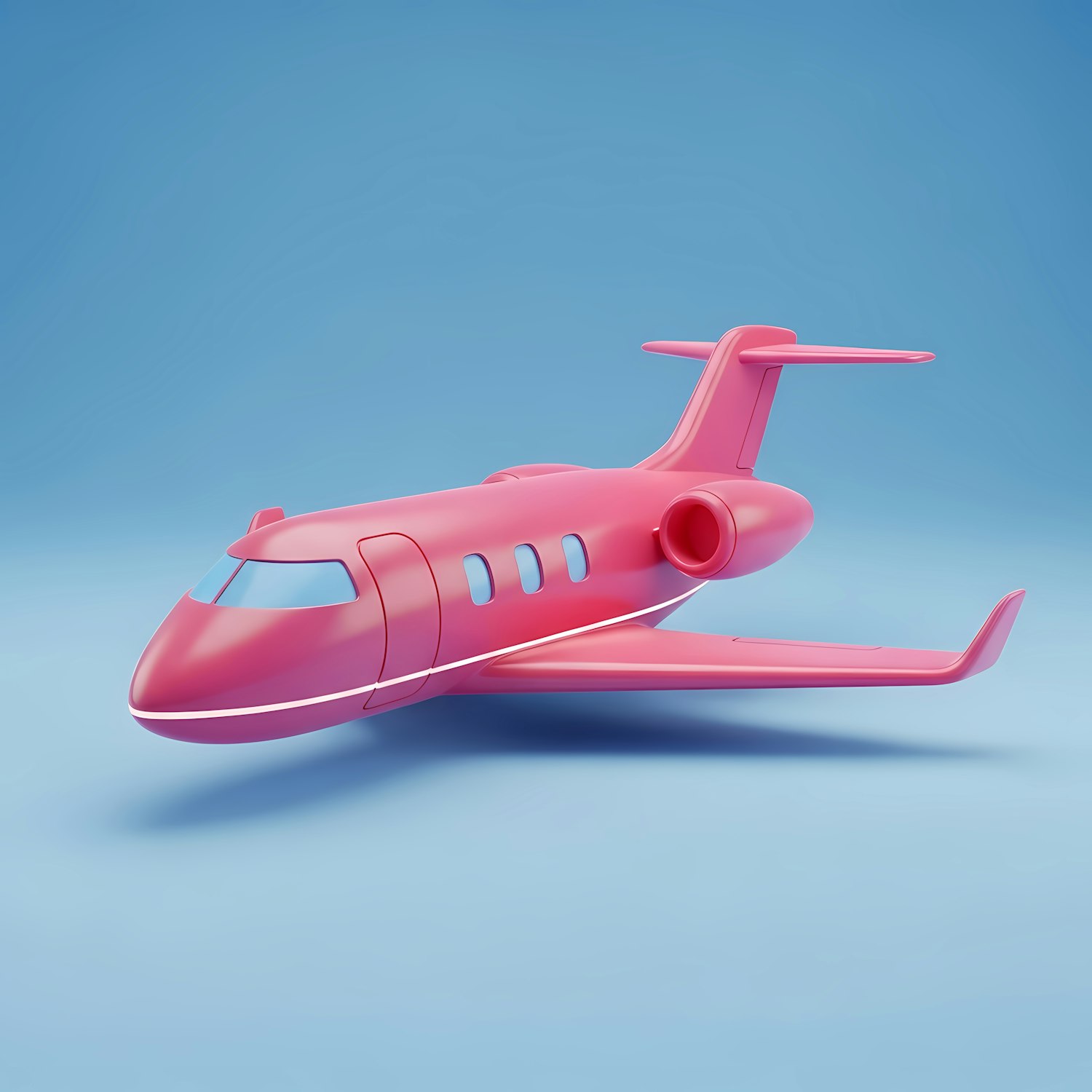 A vibrant pink private jet in a sleek 3D design against a gradient blue background, showcasing modern and minimalist aesthetics.