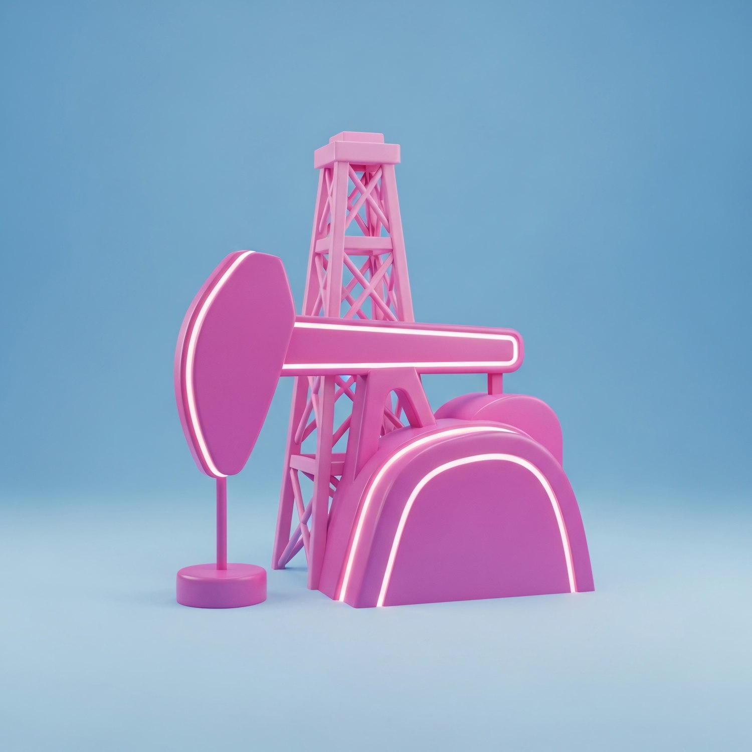 A vibrant pink 3D oil pumpjack with white highlights on a light blue background, showcasing a modern and minimalistic design.