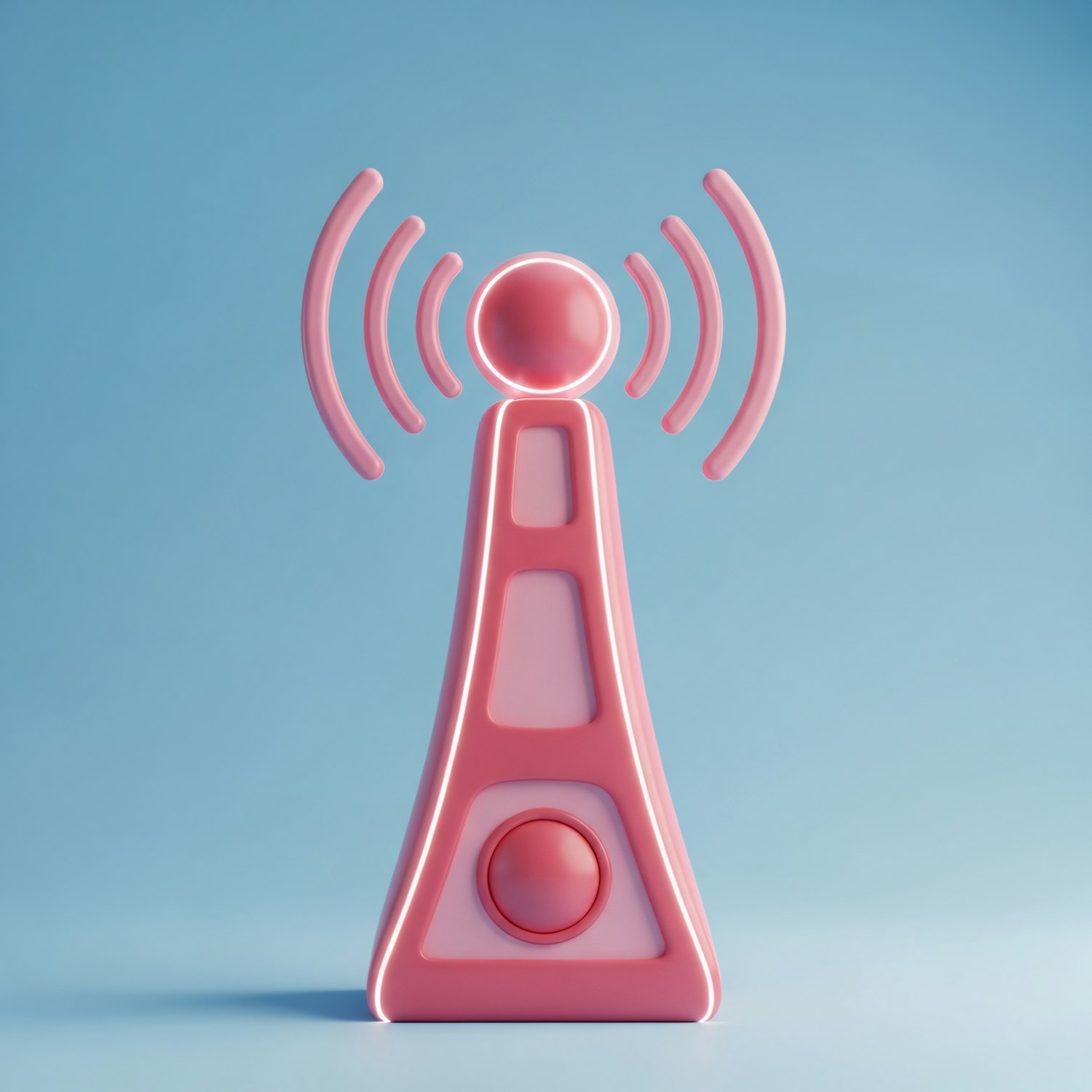 A 3D-rendered pink communication tower with signal waves on a blue gradient background, symbolizing connectivity and technology.