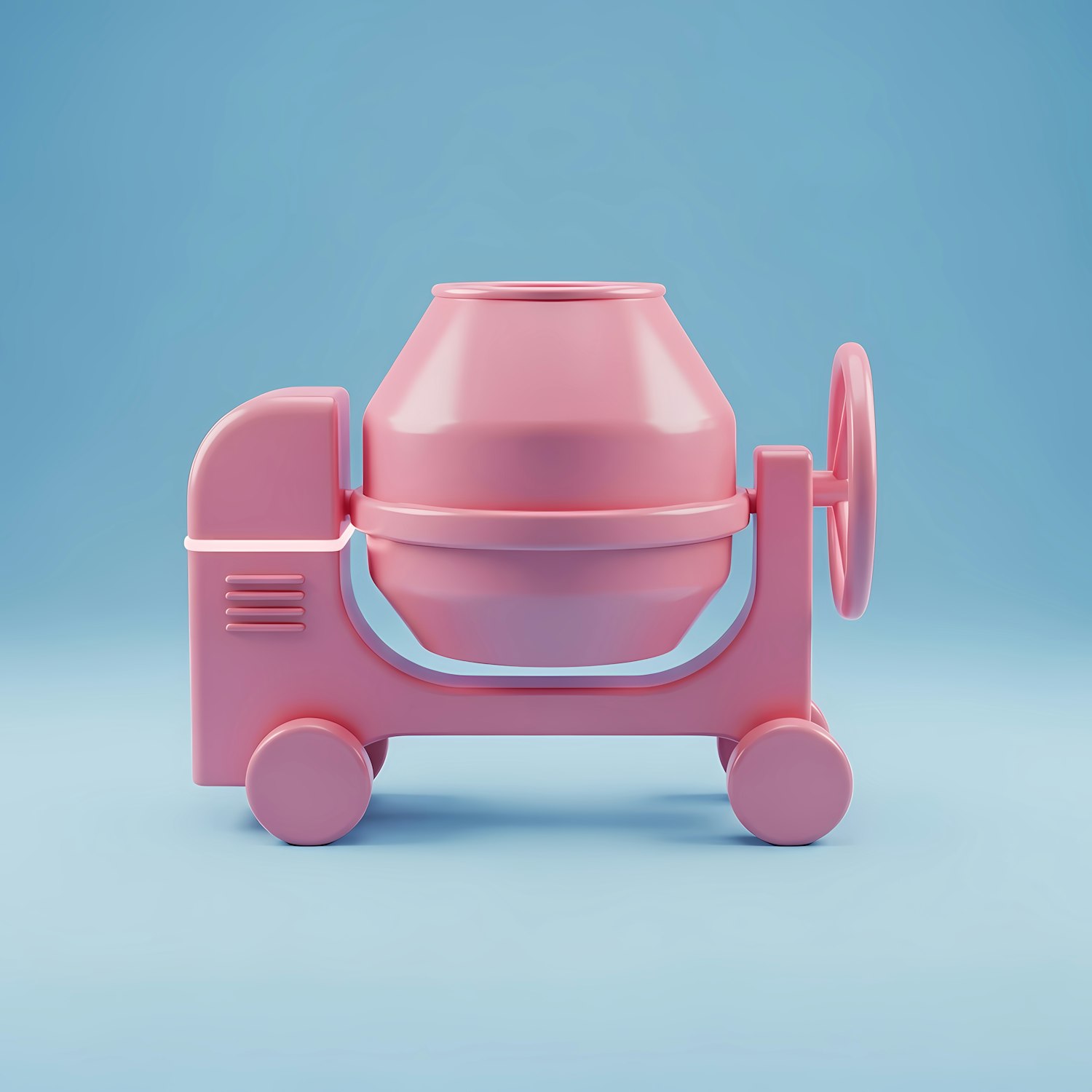 A pink toy cement mixer with a playful design, set against a light blue background. Perfect for kids' playtime or decor.