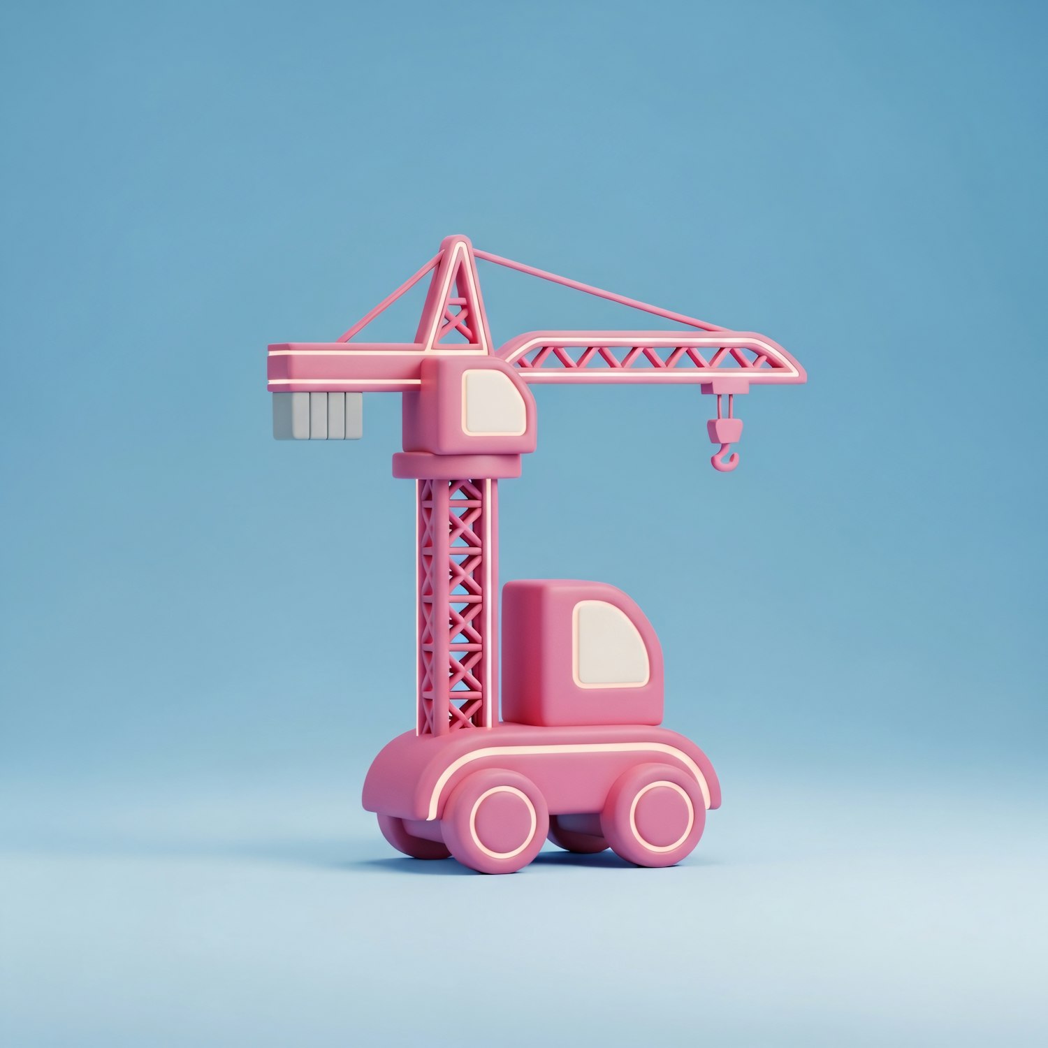 A cute pink toy crane with a playful design, set against a light blue background, perfect for children's themes or creative projects.