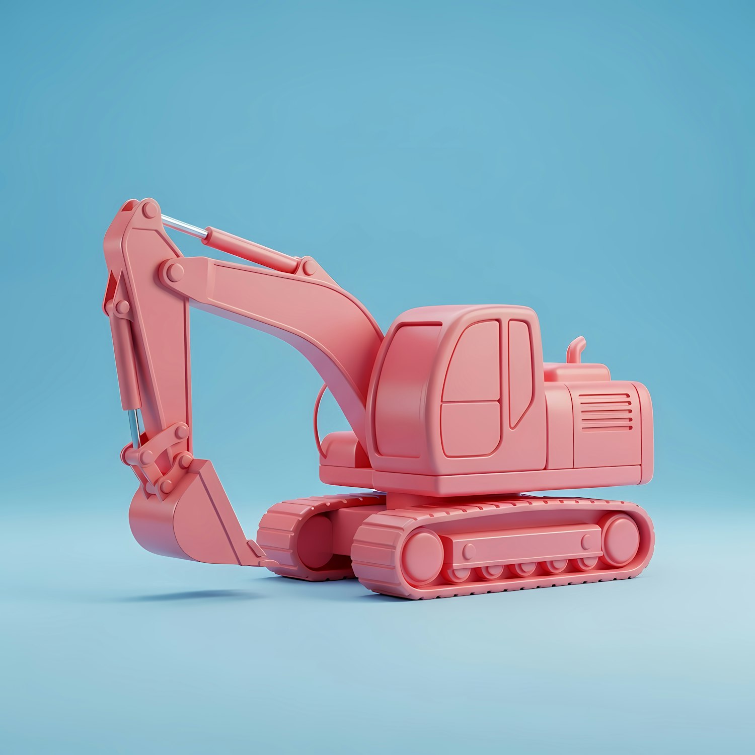 A pastel pink 3D excavator model on a light blue background, showcasing a playful and minimalistic design.