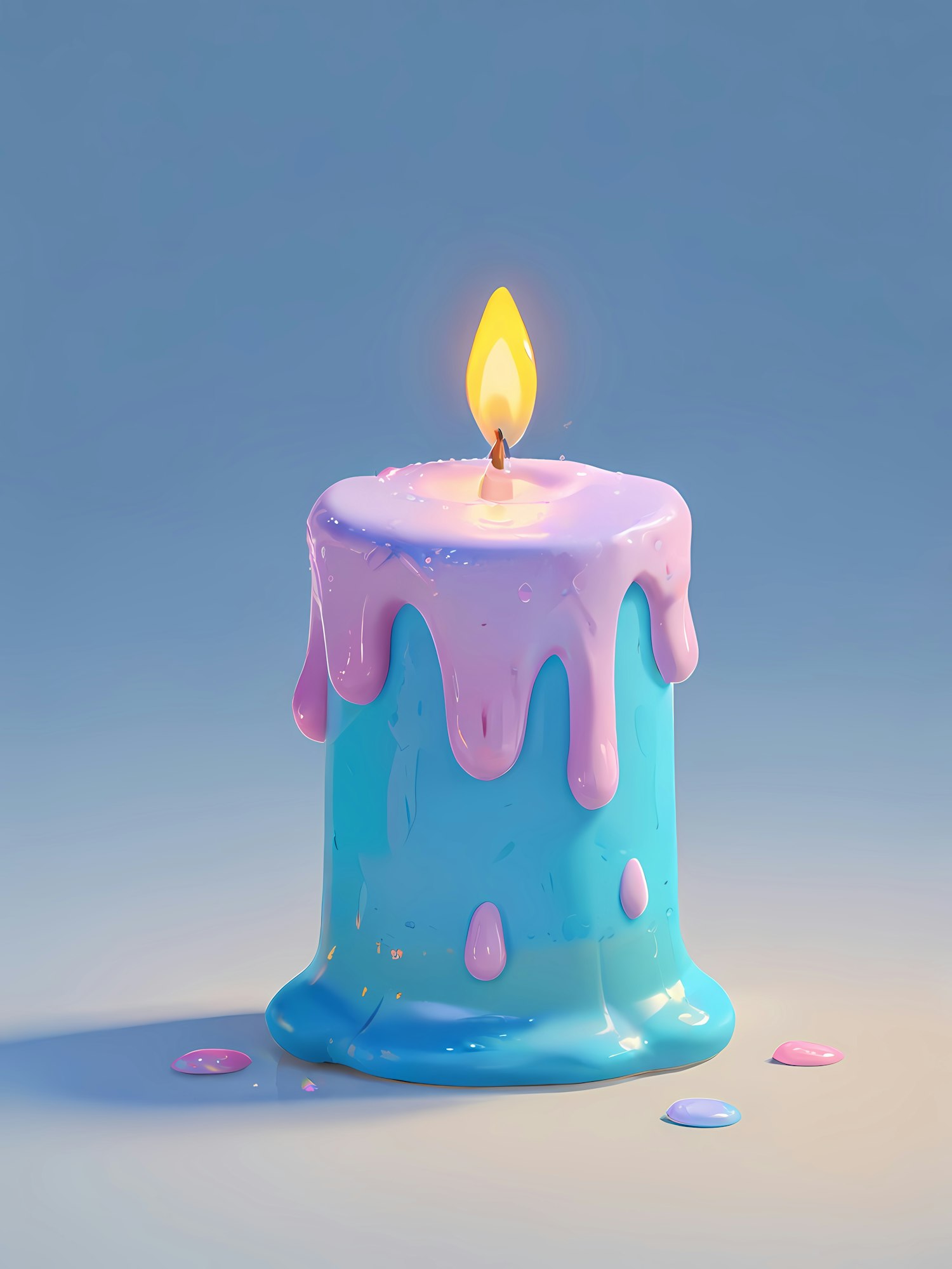 A colorful 3D-rendered candle with blue and pink wax, a glowing flame, and a soft blue background. Perfect for vibrant, playful designs.