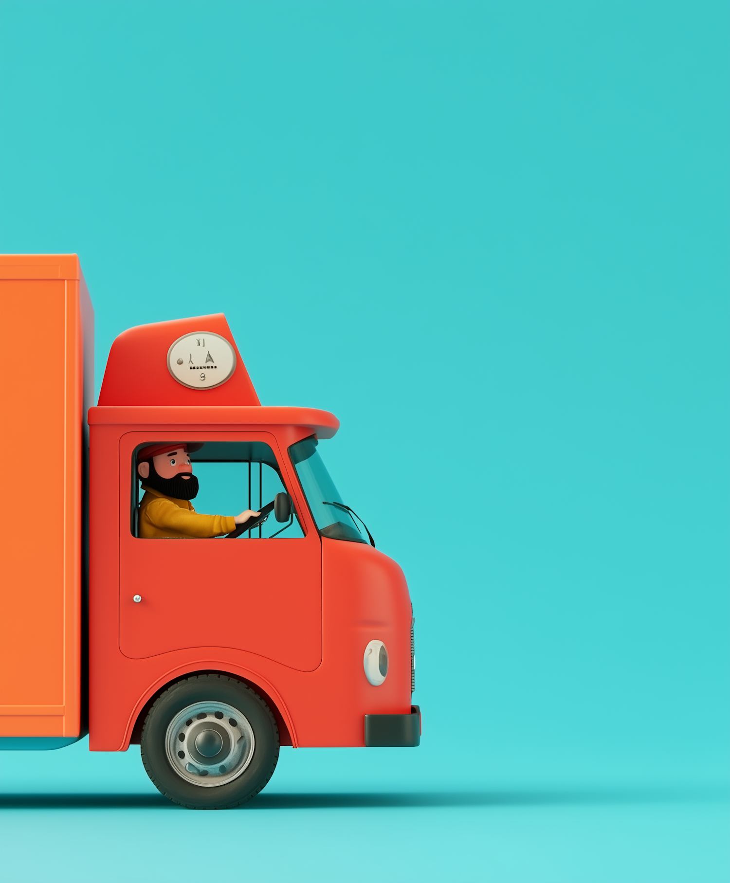 3D illustration of a retro orange delivery truck with a bearded driver, set against a turquoise background. Playful and vibrant design.
