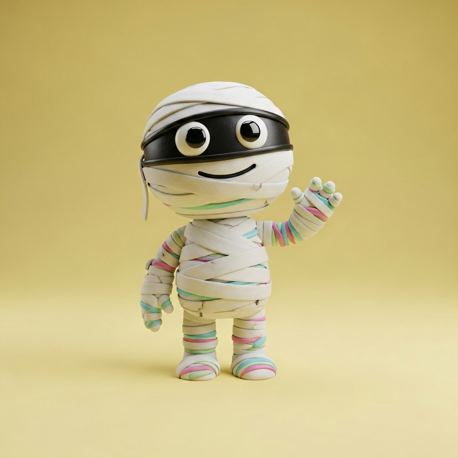 A cute 3D mummy character with colorful accents and a black mask, waving against a yellow background. Perfect for fun and creative themes.