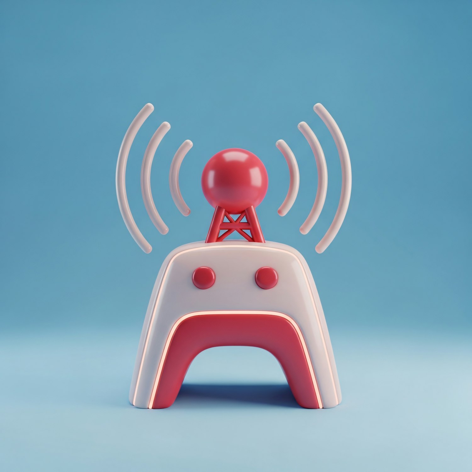 A playful 3D illustration of a radio tower with a red and white design, featuring a glossy finish and a blue background.