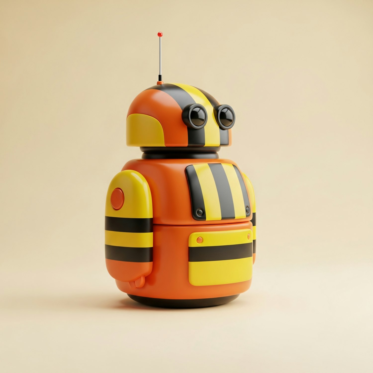 A vibrant orange and yellow robot with black stripes and a playful design, featuring a dome-shaped head and a compact, rounded body.