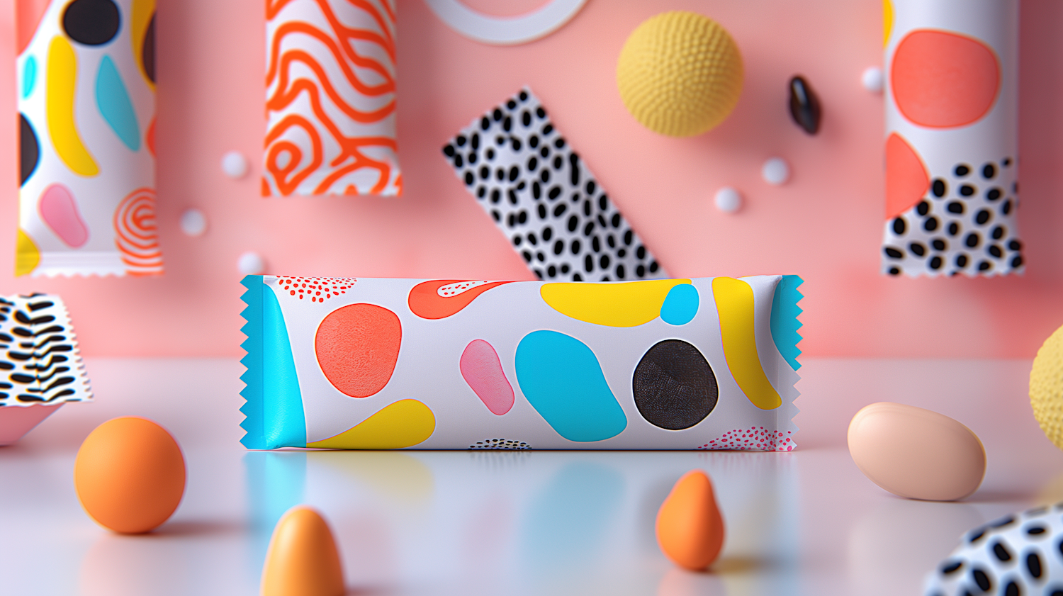 Colorful candy wrappers with abstract designs on a pink background, featuring playful shapes and vibrant colors.