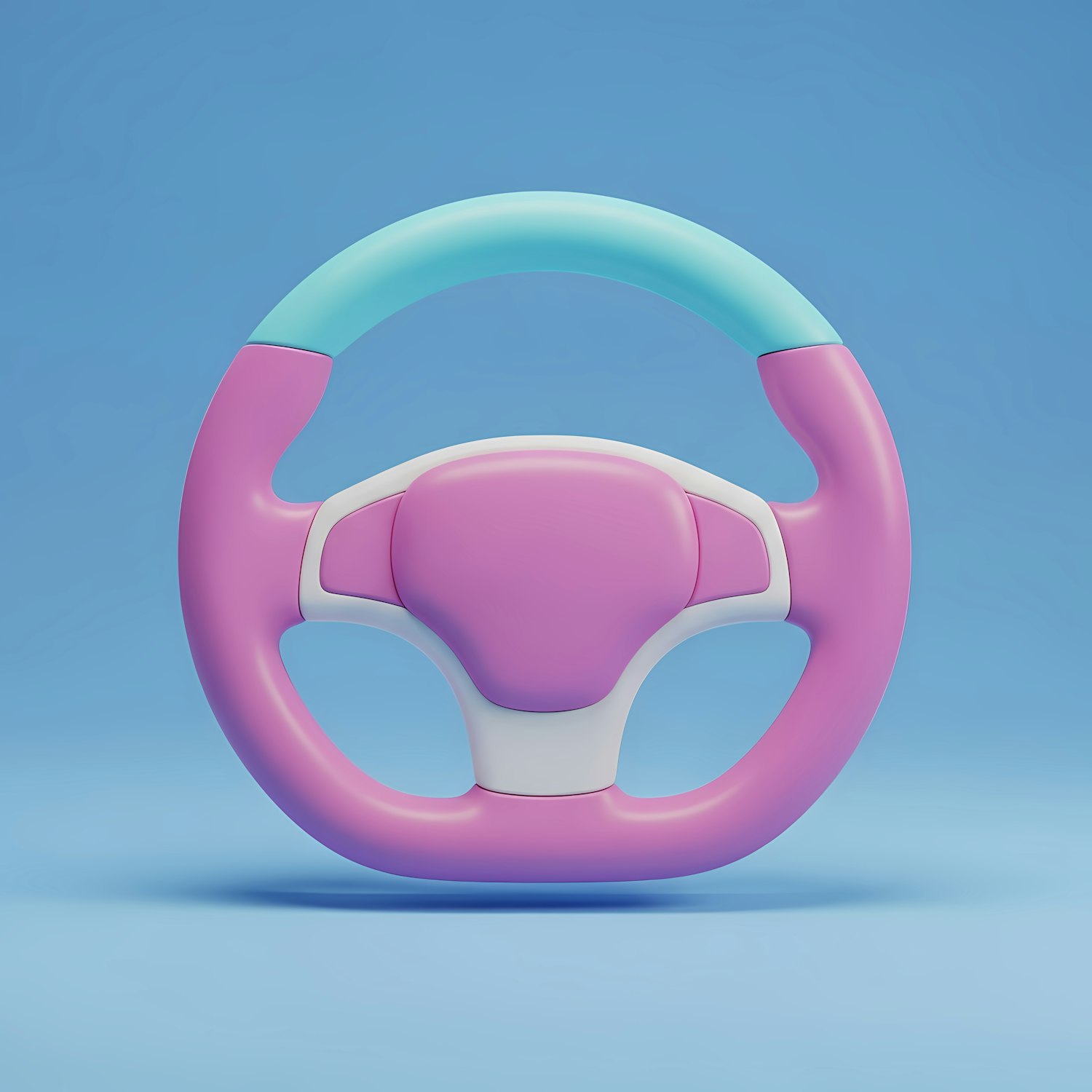 Brightly colored steering wheel in pink and blue tones, set against a vibrant blue background. Fun and modern design.