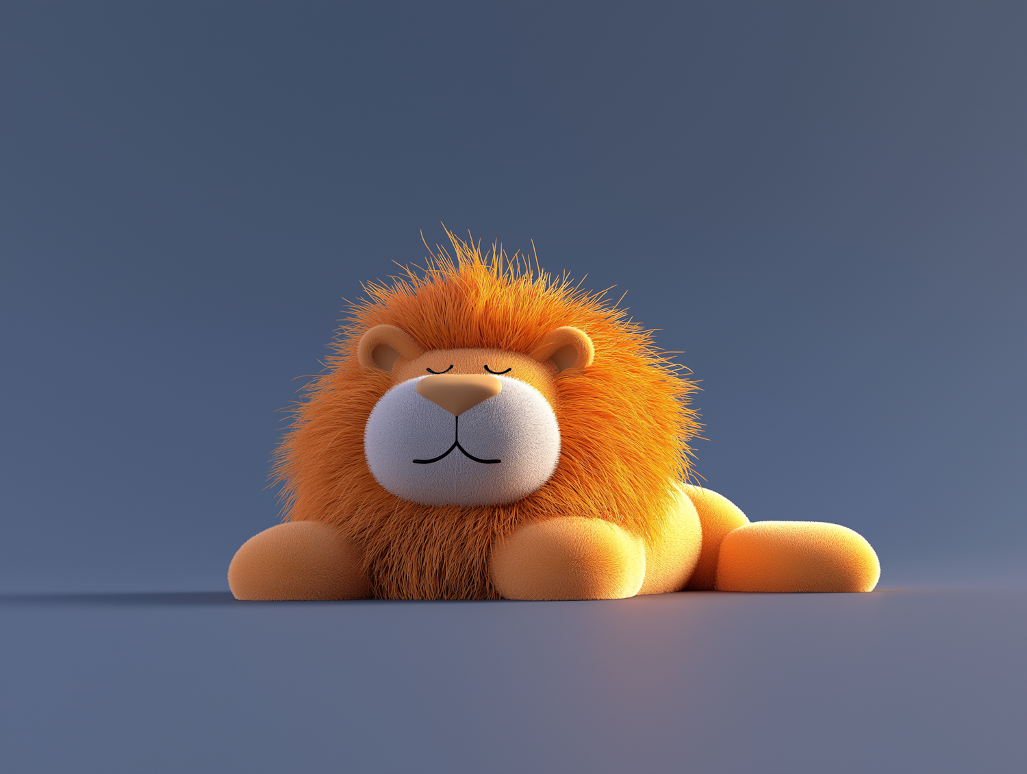 Adorable 3D cartoon lion with a fluffy orange mane, peacefully lying down against a blue background.