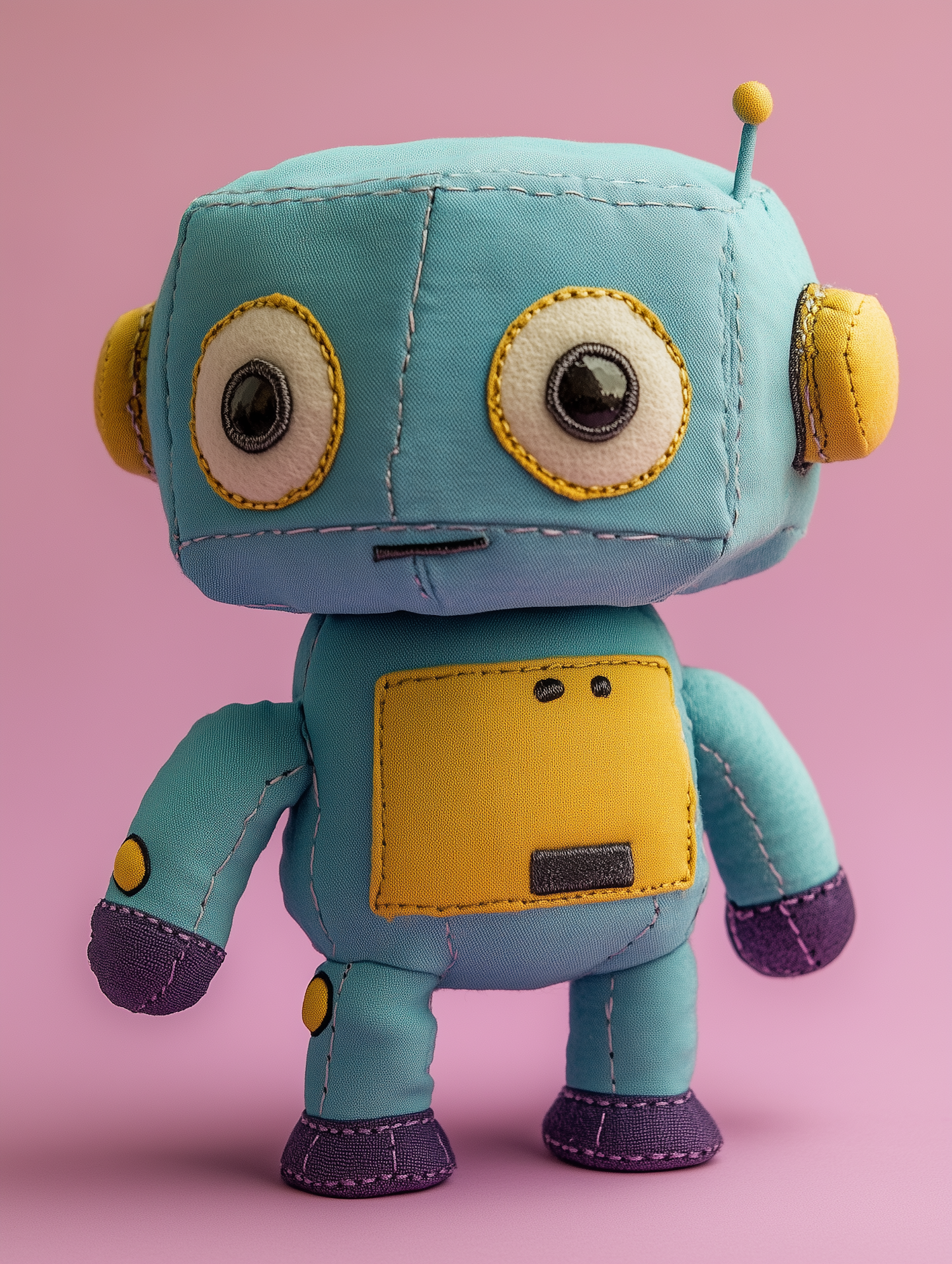 Adorable plush robot toy with turquoise body, yellow accents, and stitched details, standing against a soft pink background.