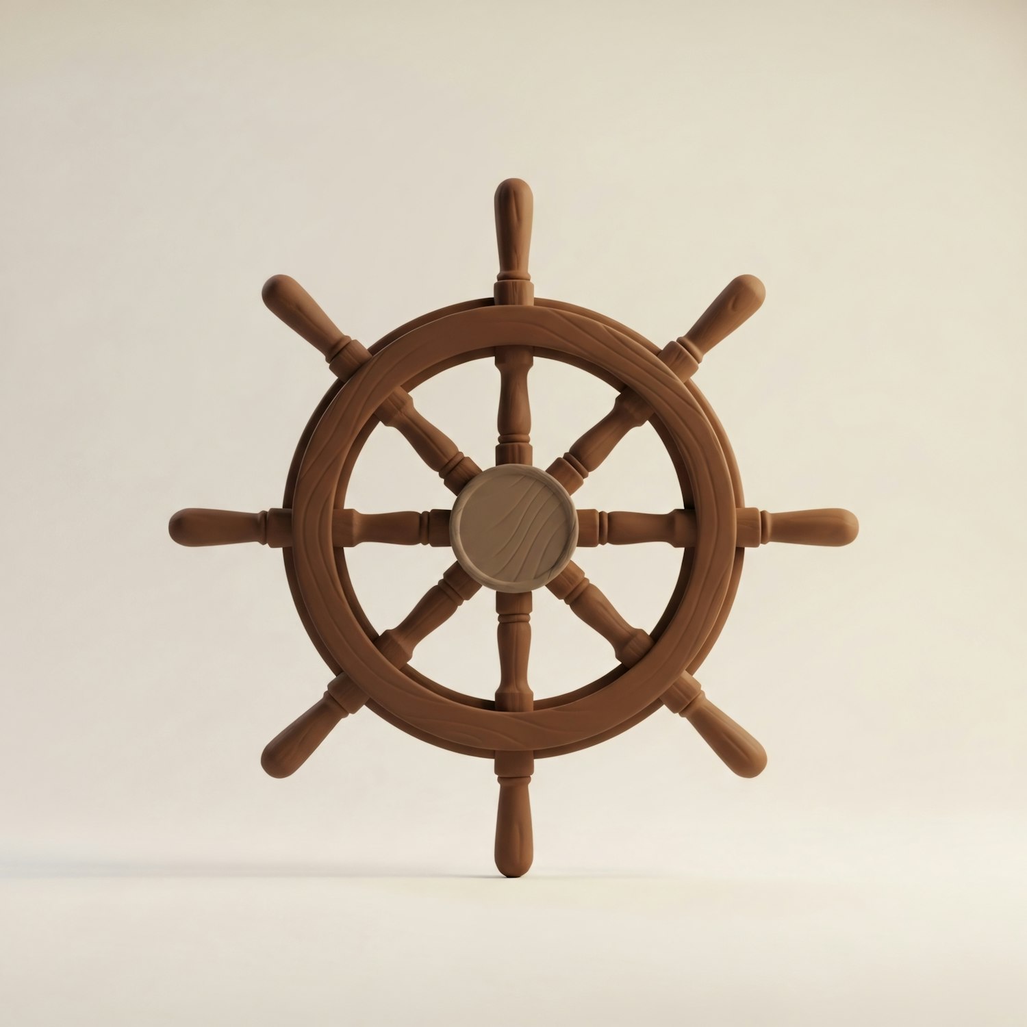 A detailed wooden ship's wheel with eight handles, set against a neutral background, showcasing its craftsmanship and polished finish.
