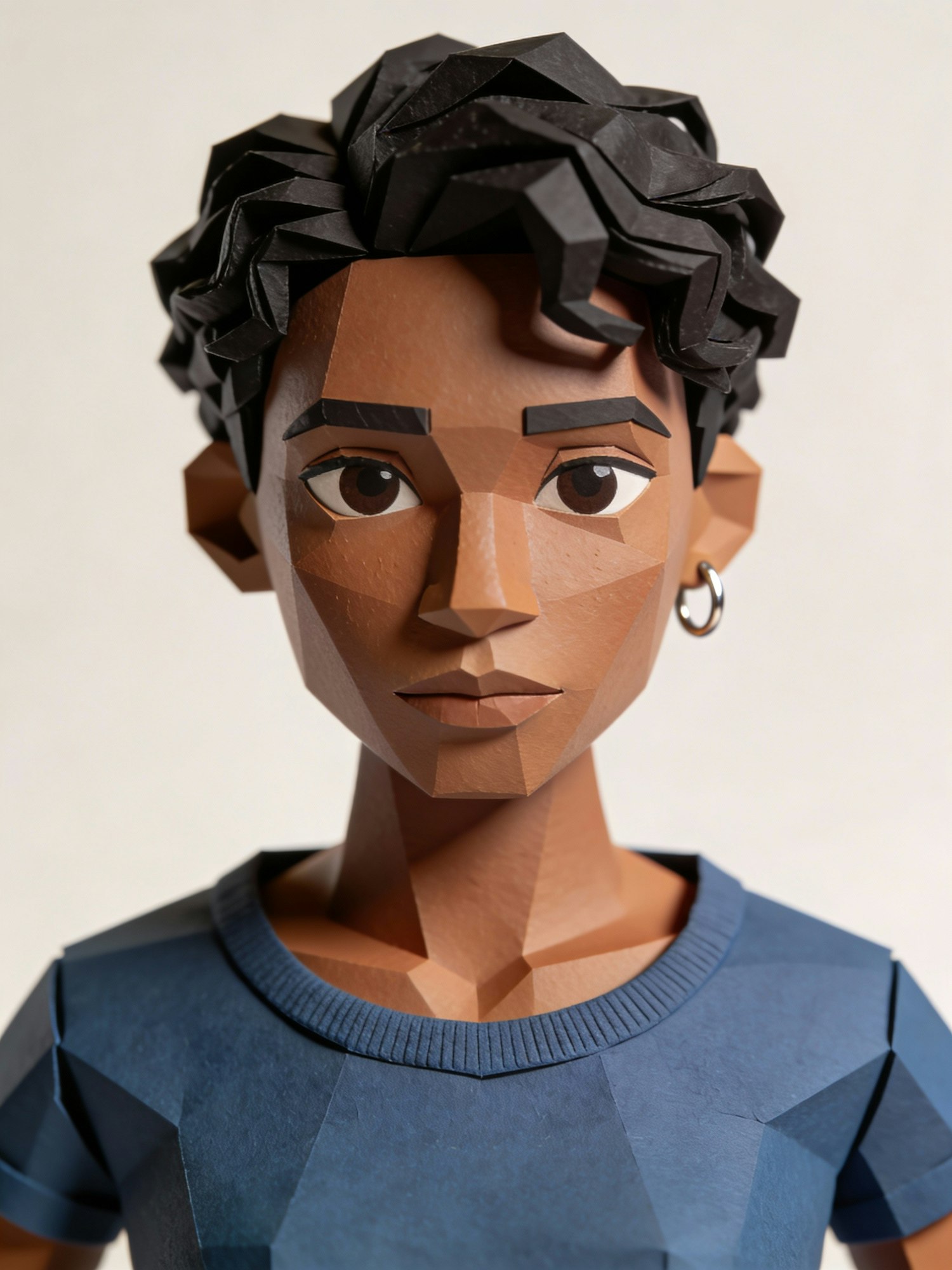 A polygonal 3D character with short black hair, brown skin, and a blue shirt, showcasing a modern and artistic design.