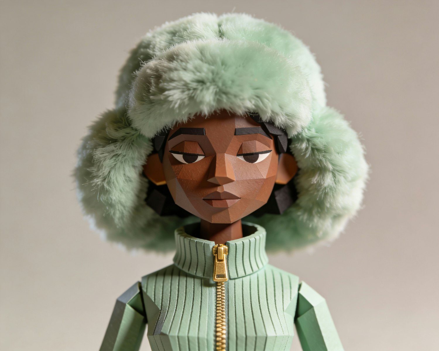 Stylized 3D character with a polygonal design, wearing a light green fluffy hat and jacket, set against a neutral background.
