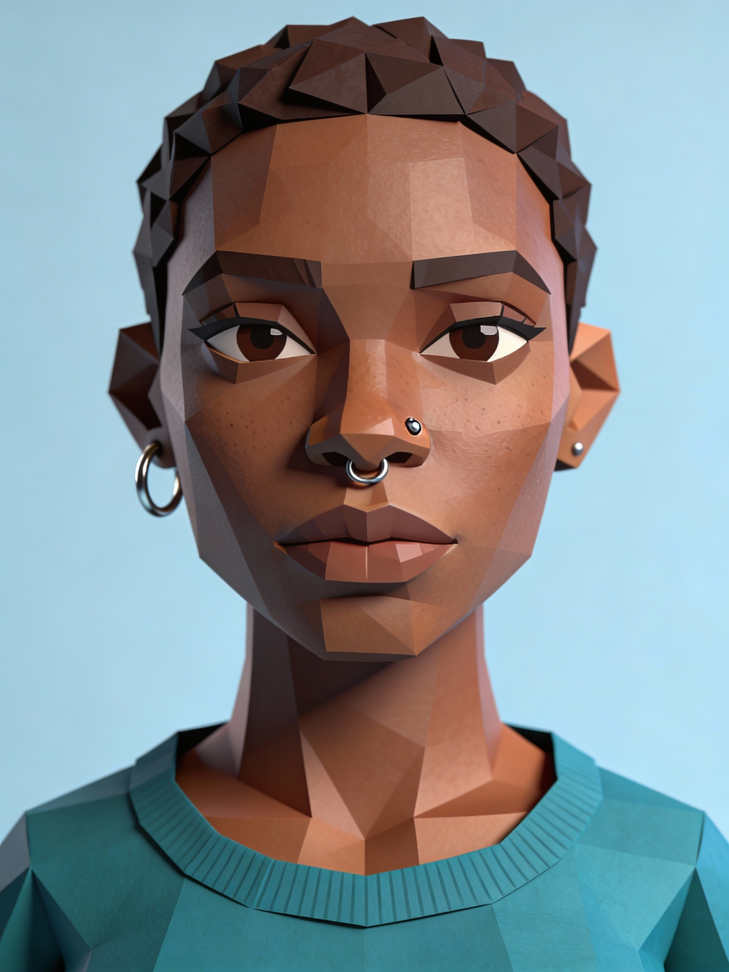 Stylized 3D portrait of a person with geometric features, short hair, teal shirt, and hoop earrings against a soft blue background.