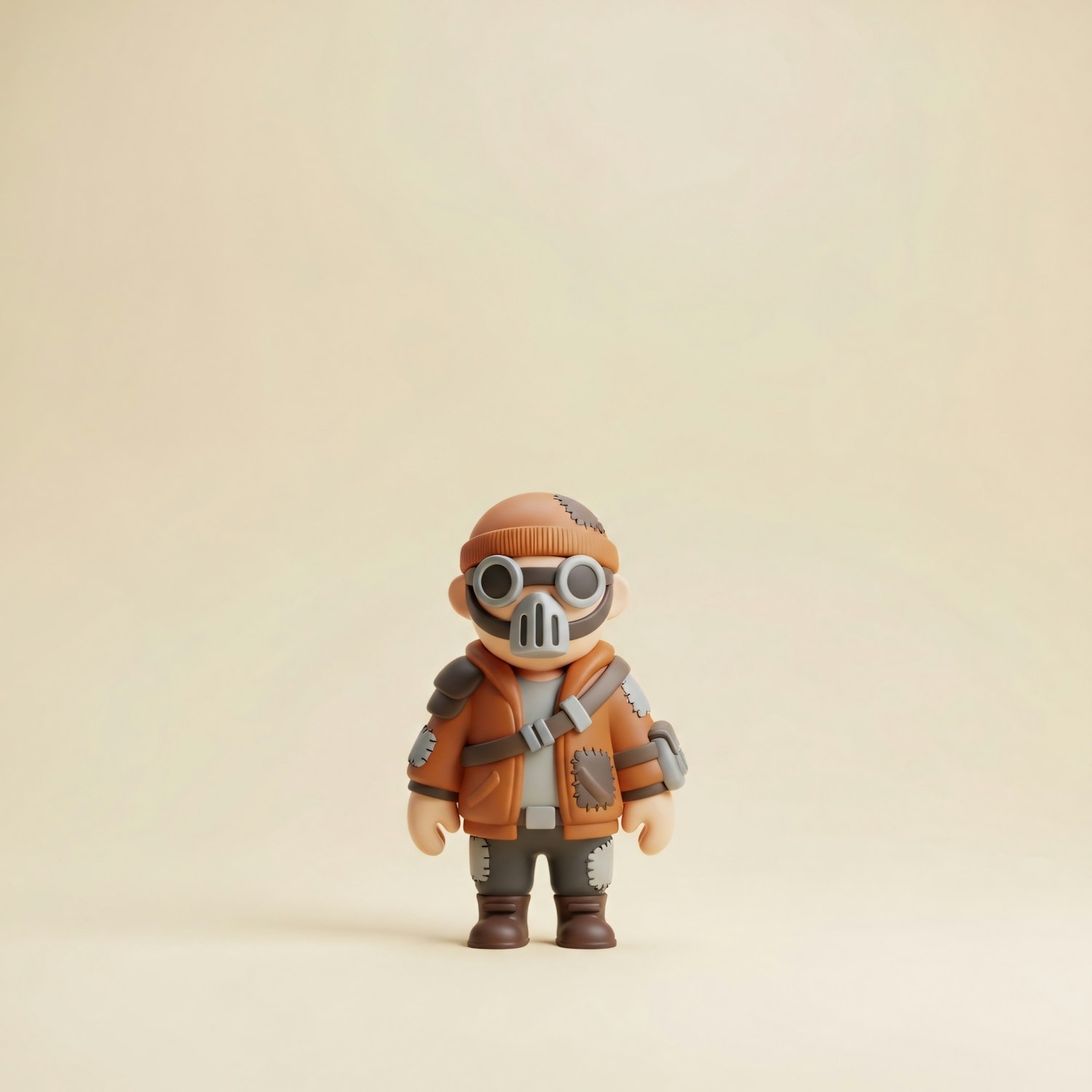 A stylized figurine in a patched orange jacket and gas mask, set against a plain beige background, showcasing a rugged, cartoonish design.