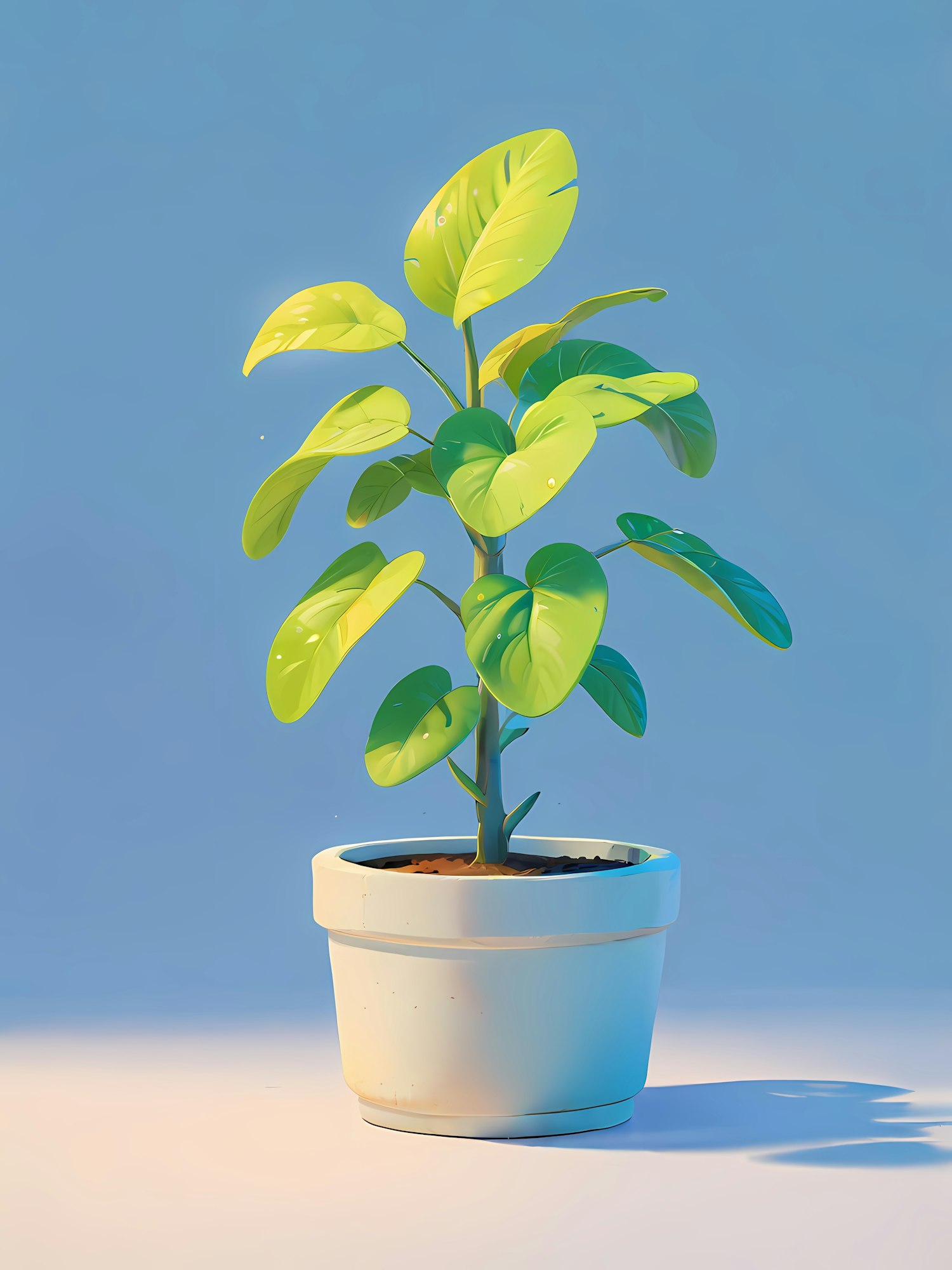 A minimalistic illustration of a potted plant with glossy green leaves in a white pot, set against a soft blue background.