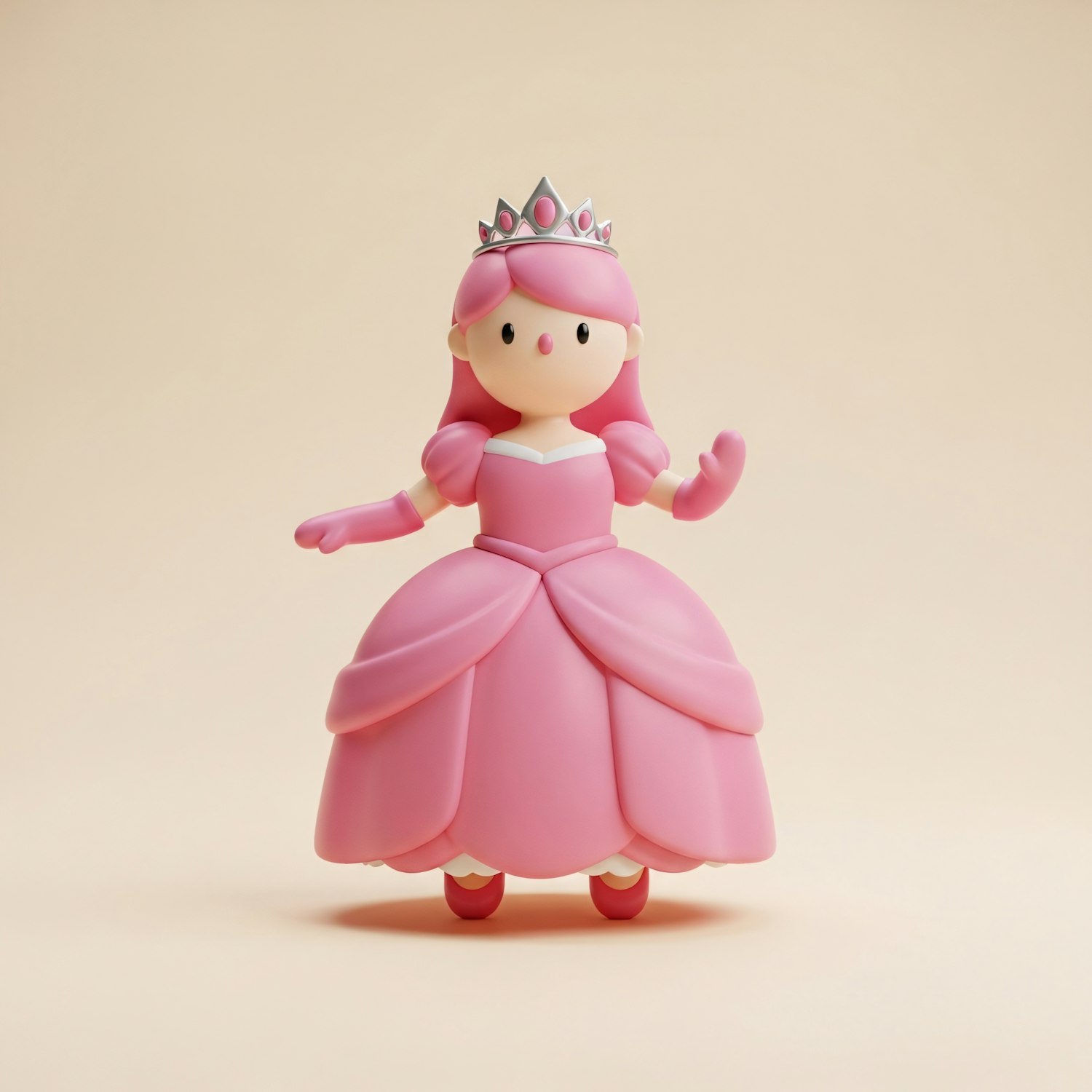 A cute figurine of a princess in a pink dress and tiara, set against a soft beige background, showcasing a whimsical and playful design.