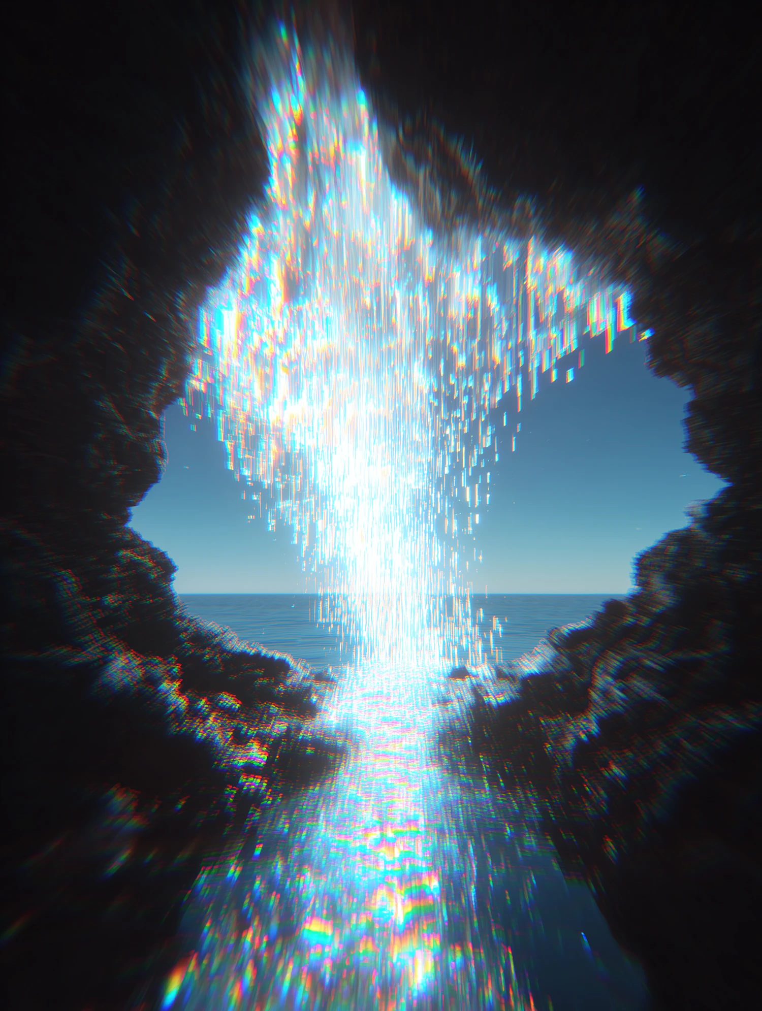 A stunning view of light cascading through a rock formation, creating a prismatic effect over a calm ocean horizon.