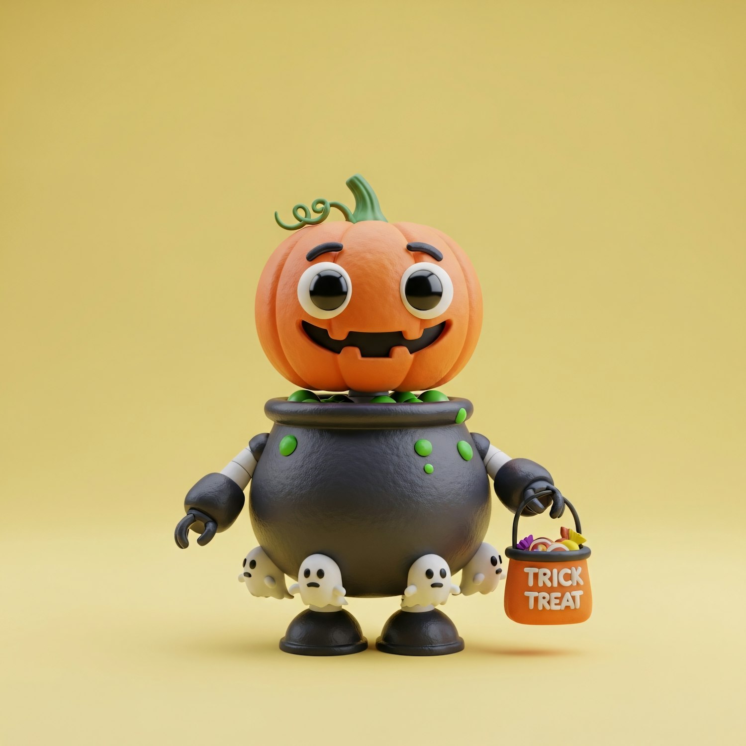 A cute 3D pumpkin-headed character holding a candy bucket, perfect for Halloween-themed designs and decorations.