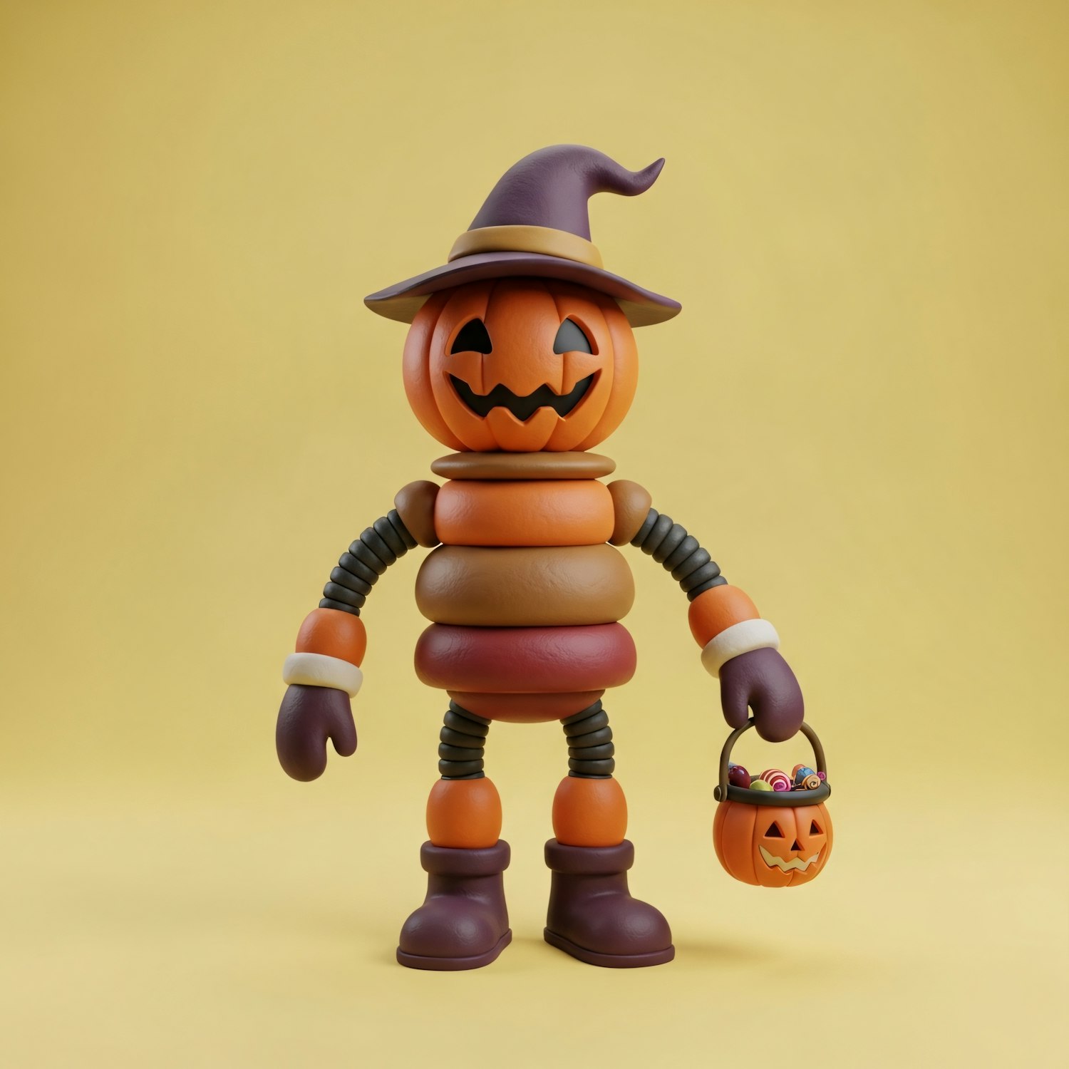A 3D-rendered pumpkin character with a witch hat and candy bucket, perfect for Halloween-themed designs and decorations.