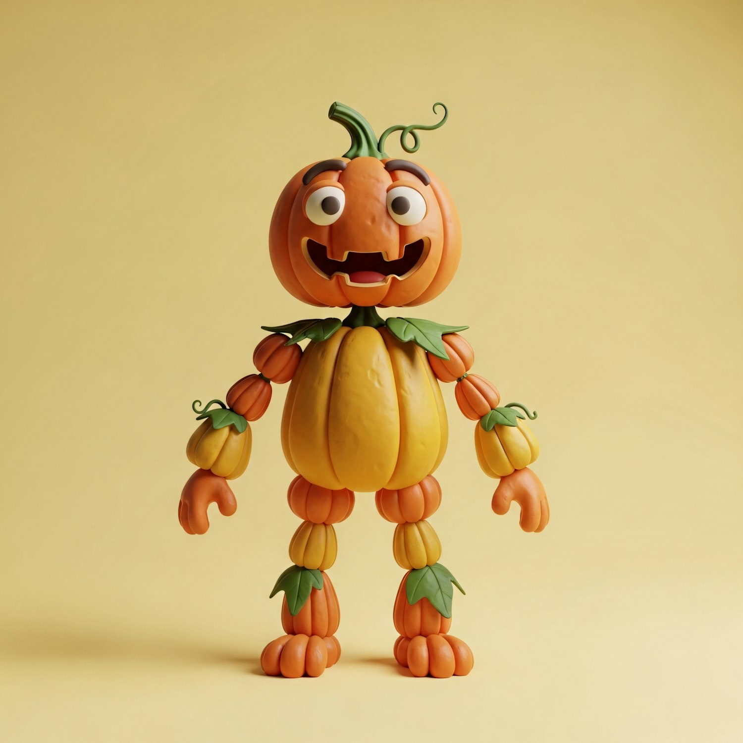 A playful pumpkin character with a carved face and gourd limbs, set against a light yellow background, perfect for autumn themes.